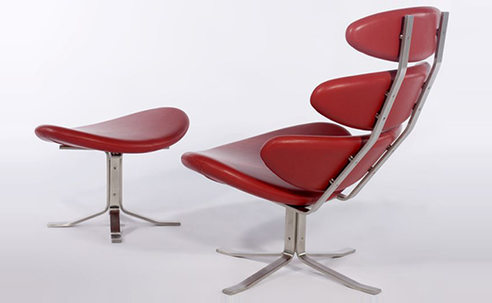 Poul M. Volther 于1964年的设计的王冠躺椅家具系列,是Poul M. Volther最知名的现代家具设计作品,此系列包括Corona Lounger Chair(王冠躺椅)、Corona Lounger Ottoman (王冠休闲脚踏)及其组合Corona Lounger Chair and Ottoman(王冠躺椅&脚踏)。历经40余年的今天,其作品在纷繁现代家具设计中仍占有一席之地。椅子充满了雕塑感,斯堪德维亚风格的简洁外形和舒适的坐感都是这张椅子成为创世之作的原因,四个椭圆形组成一张独特的椅子,无论摆放在哪,都令人过目不忘。此系列家具采用高强度钢材制作,表面电镀处理,外面为真皮或布艺制作,可360度旋转,不可后仰。适用范围广,酒店、会所、高档餐厅、夜总会、别墅等。
