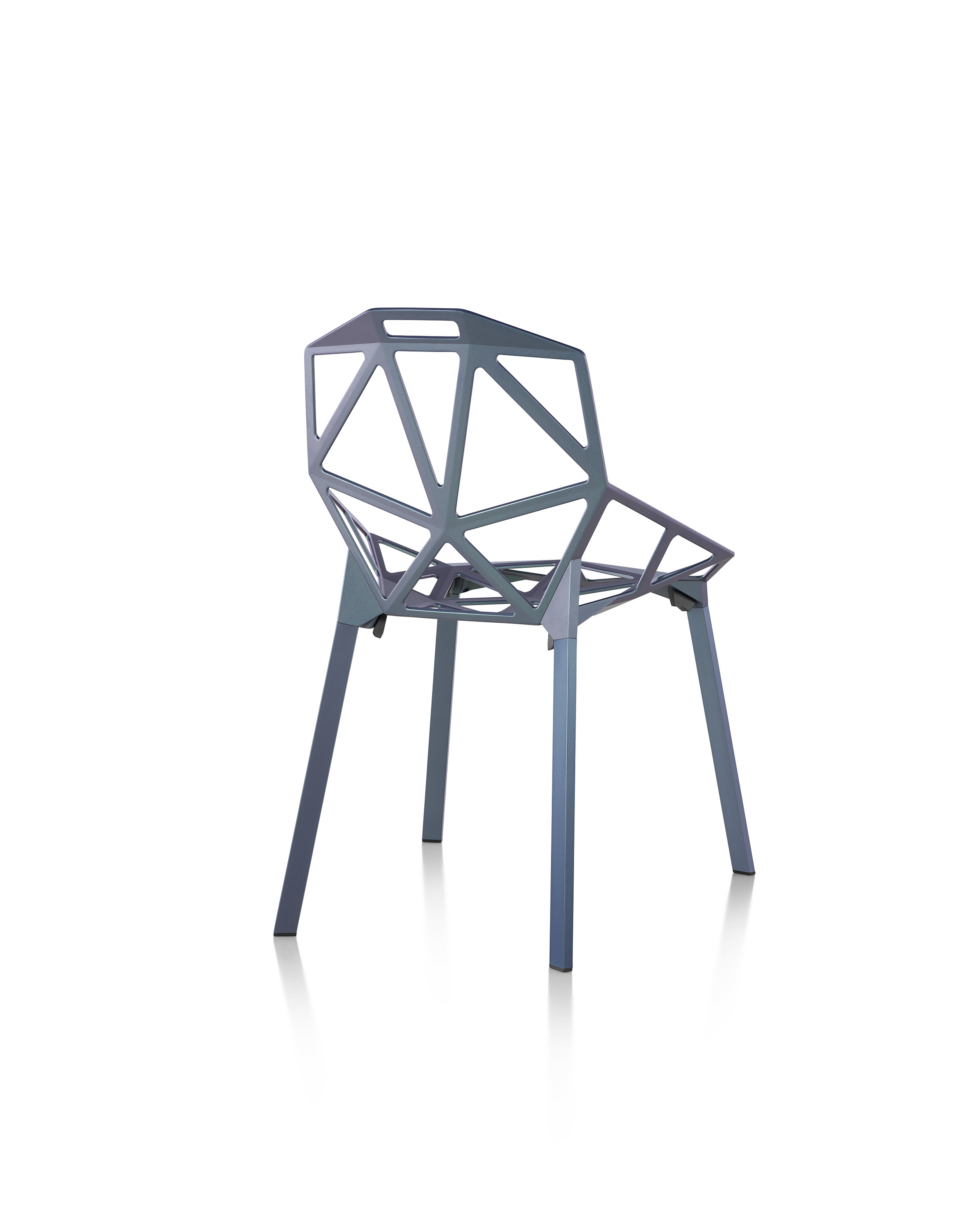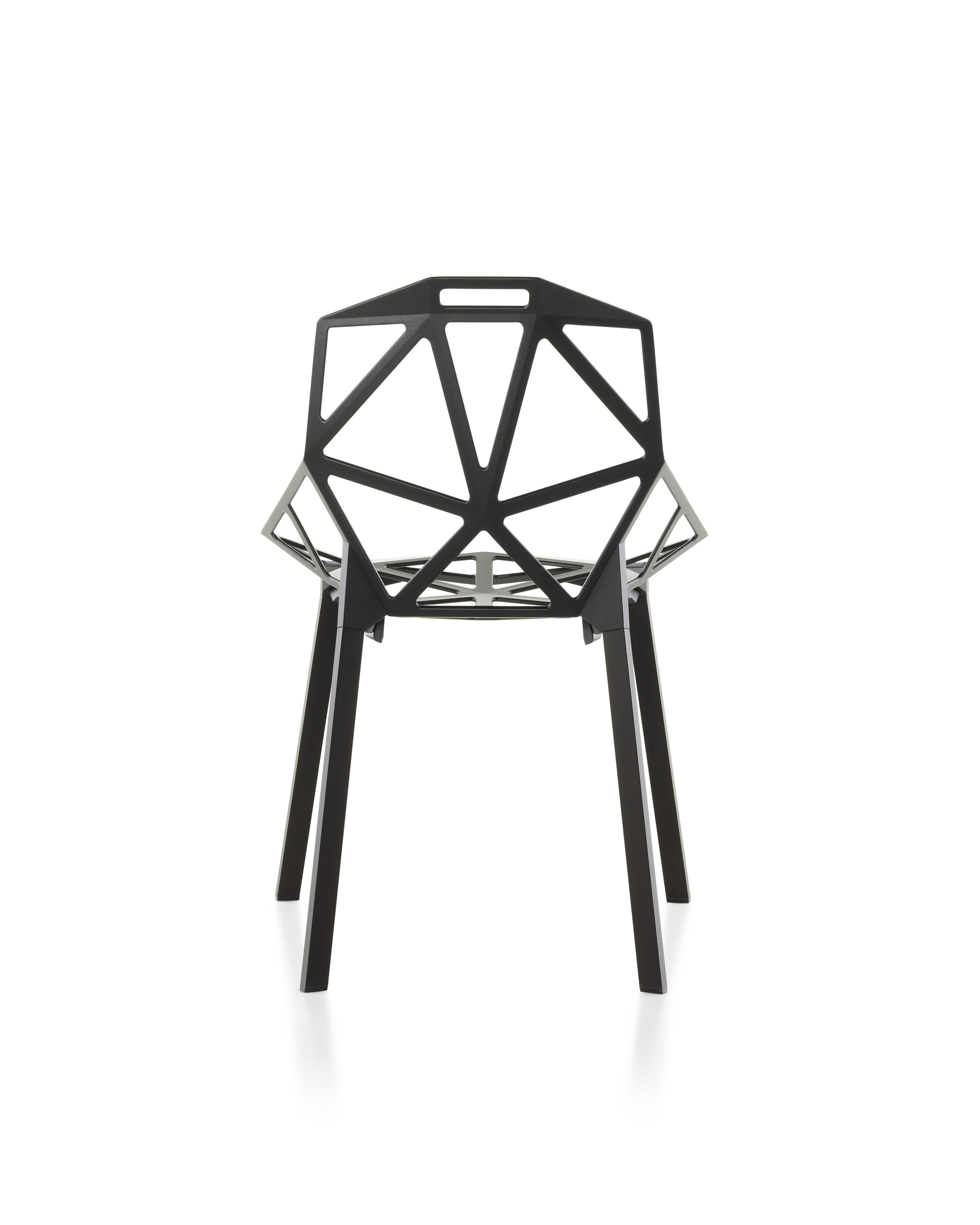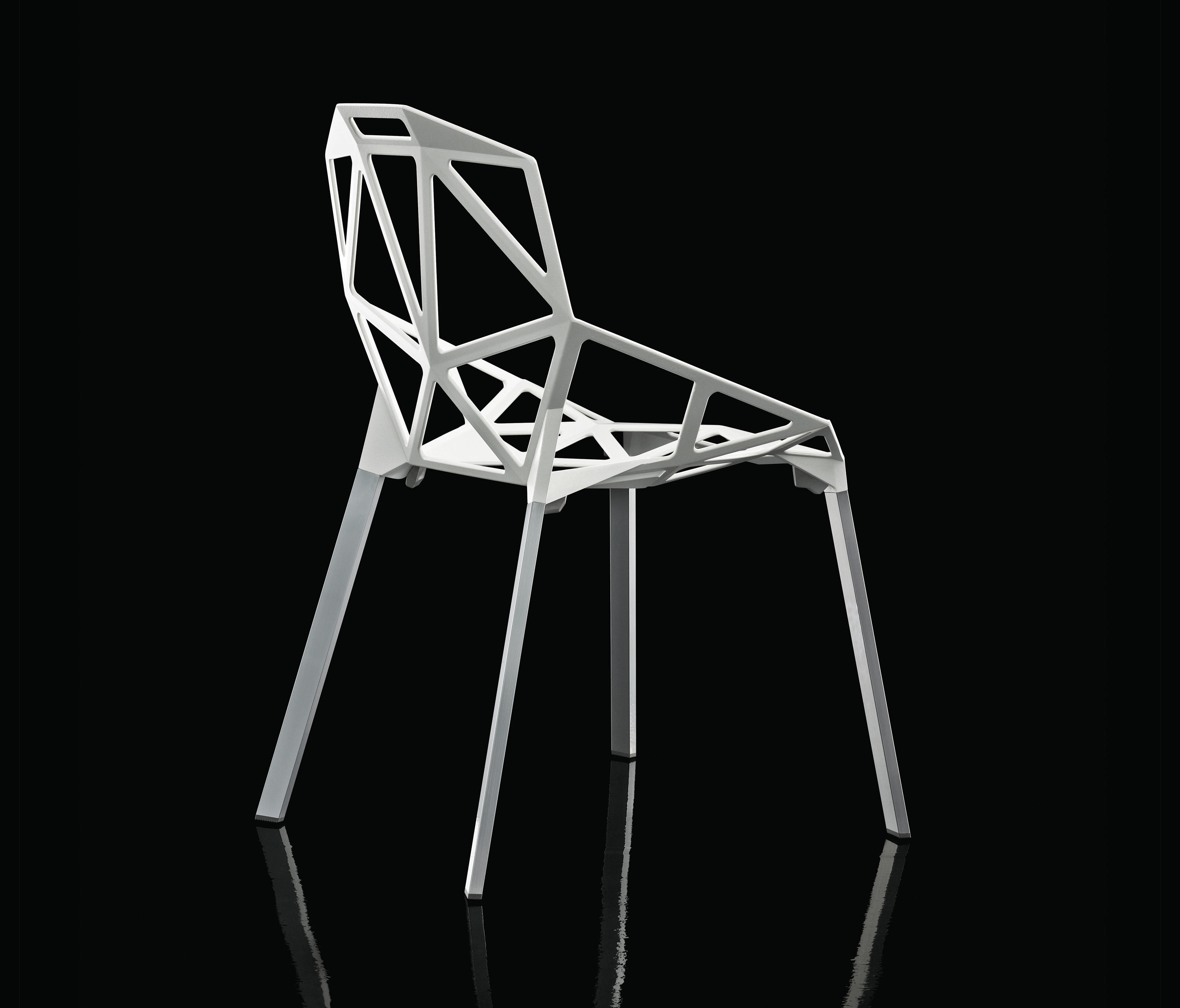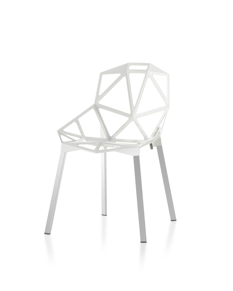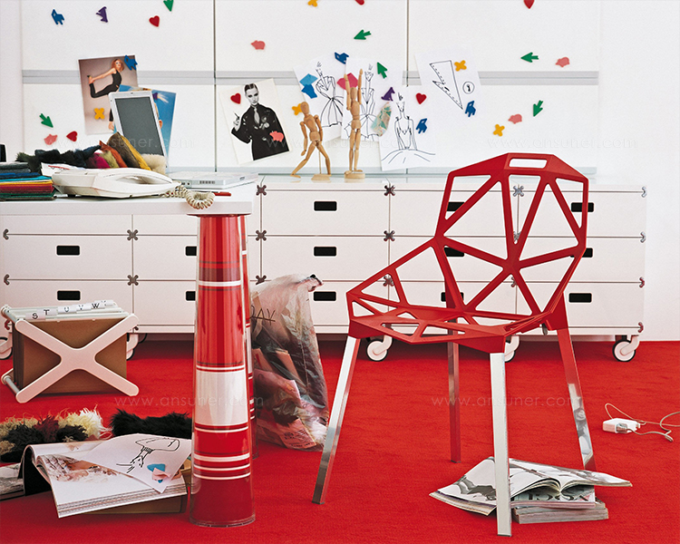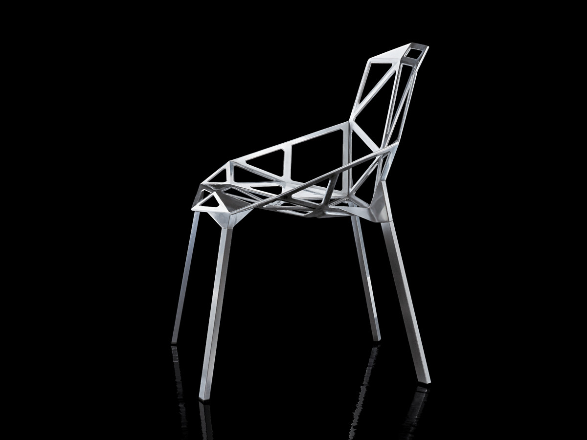 最受瞩目的德国设计师Konstantin Grcic 应邀为MAGIS 设计的Chair One(几何吧椅),是设计生涯中最具有标志的产品之一。办公椅体为模铸铝合金结构,经过氟化钛镀膜与塑料粉末涂布。椅子具有阻燃性、抗腐蚀性。适合室内及室外使用。以铝金属与钛金属制成的 Chair One,以多个平面以不同角度组合而成,建立起立体的外型。多个中空的三角型组合而成的座椅,不但令为用家带来强而有力的承托结构,而且还能在简单设计之中带出不一样的风格。这把椅子的惊人形象难免使人对它的舒适度产生疑问,但当你真正坐于其上,你会发现它实际上非常舒适,那些稀疏的网状结构能够极好地支撑不同体型的人体,后背上的把手也非常实用。当你知道Chair-One最初是被当作户外用椅而设计的,你会更加佩服Konstantin Grcic的缜密用心:极少的表面可以杜绝雨水,并且减少灰尘堆积,夸张的形态则令它能够在街道、建筑或自然的环境中拥有自己美学上的存在,而不是被环境所吞没。Konstantin Grcic花了三年时间设计Chair One,自2003年诞生以来,堪称Grcic精简主义风格的代表作。2006年,Chiar One为Konstantin Grcic赢得了德国政府的设计大奖。