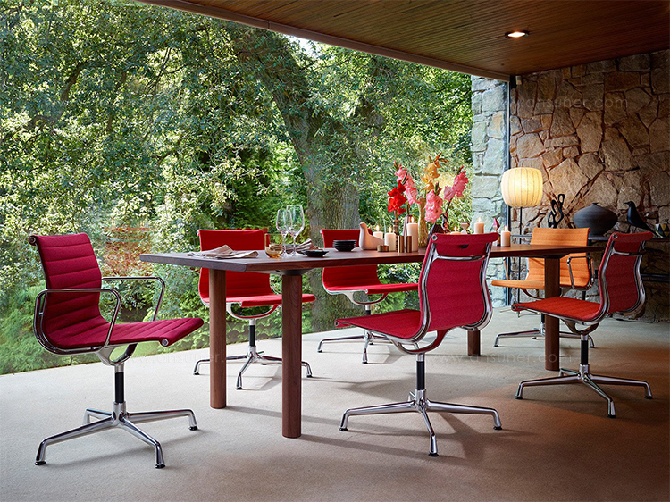 Charles和Ray Eames的铝椅EA 101,EA 103和EA 104非常适合与桌子组合使用:与铝组的其他型号相比,它们更轻,更高,更窄。 由于室内装潢具有多种柔和鲜艳的色彩,因此很容易找到适合任何餐厅的完美椅子。 这三种型号的不同之处在于基座的类型 - 固定或旋转 - 以及是否存在臂。