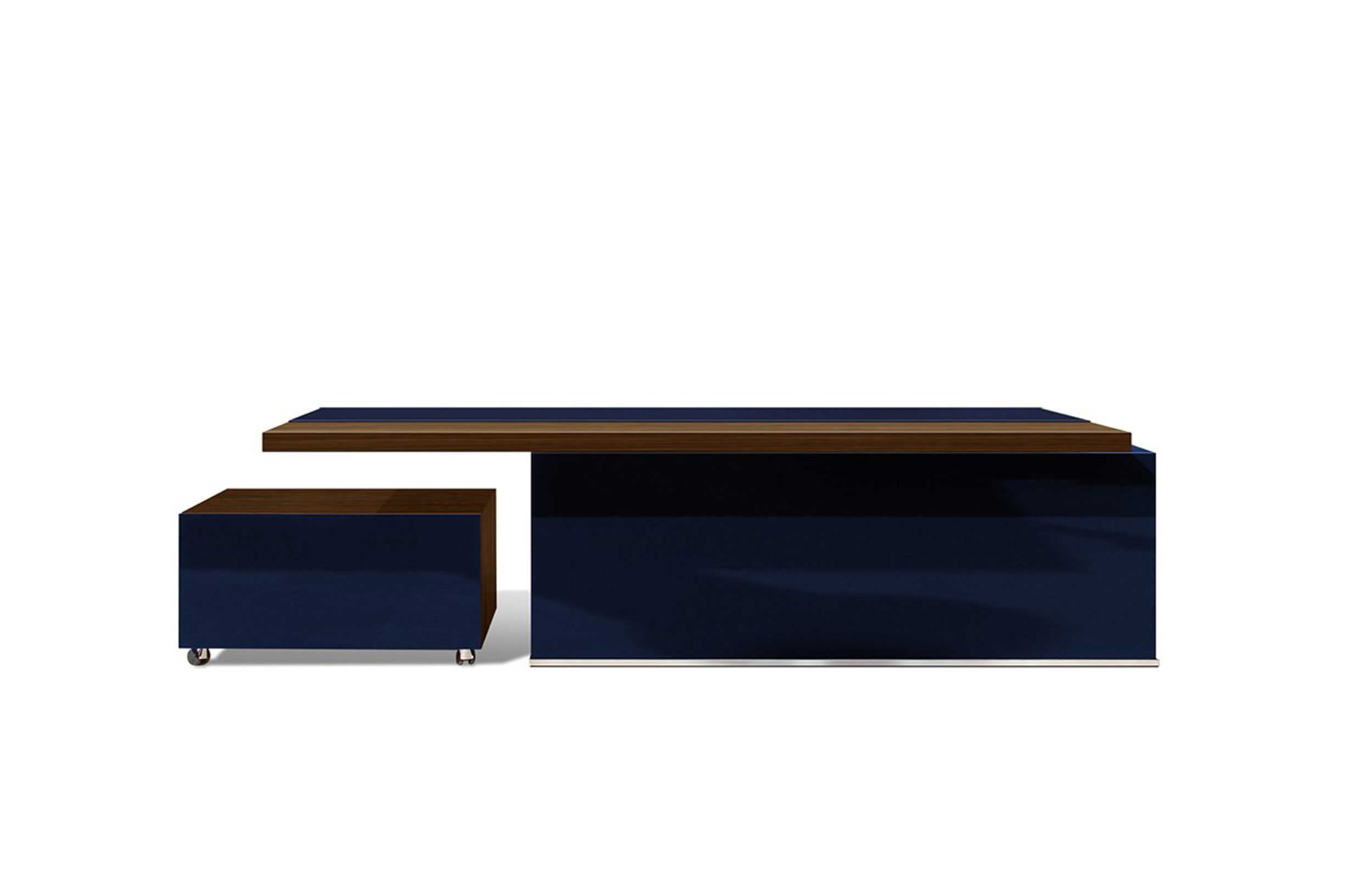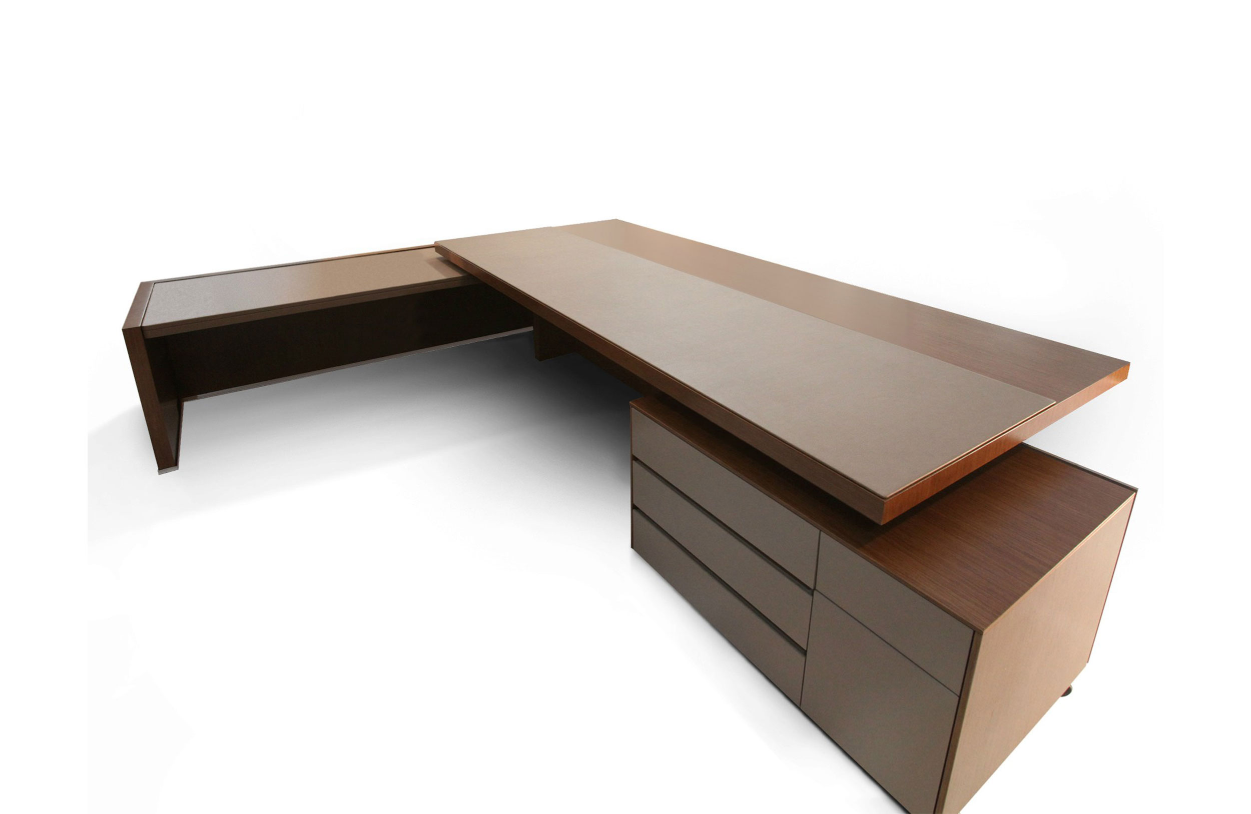 轻质加固50mm厚桌面桌,采用金属核心结构。工作桌面区域采用Techno Leather软垫。50mm结构前板在底部用不锈钢板完成。“L”形前板隐藏在主桌面下方的滑动翼。当滑动桌翼打开时,沿着桌子的整个长度配备集成的电缆管理。(需要说明的是,桌面机翼在右侧或左侧,相对于工作桌面位置)