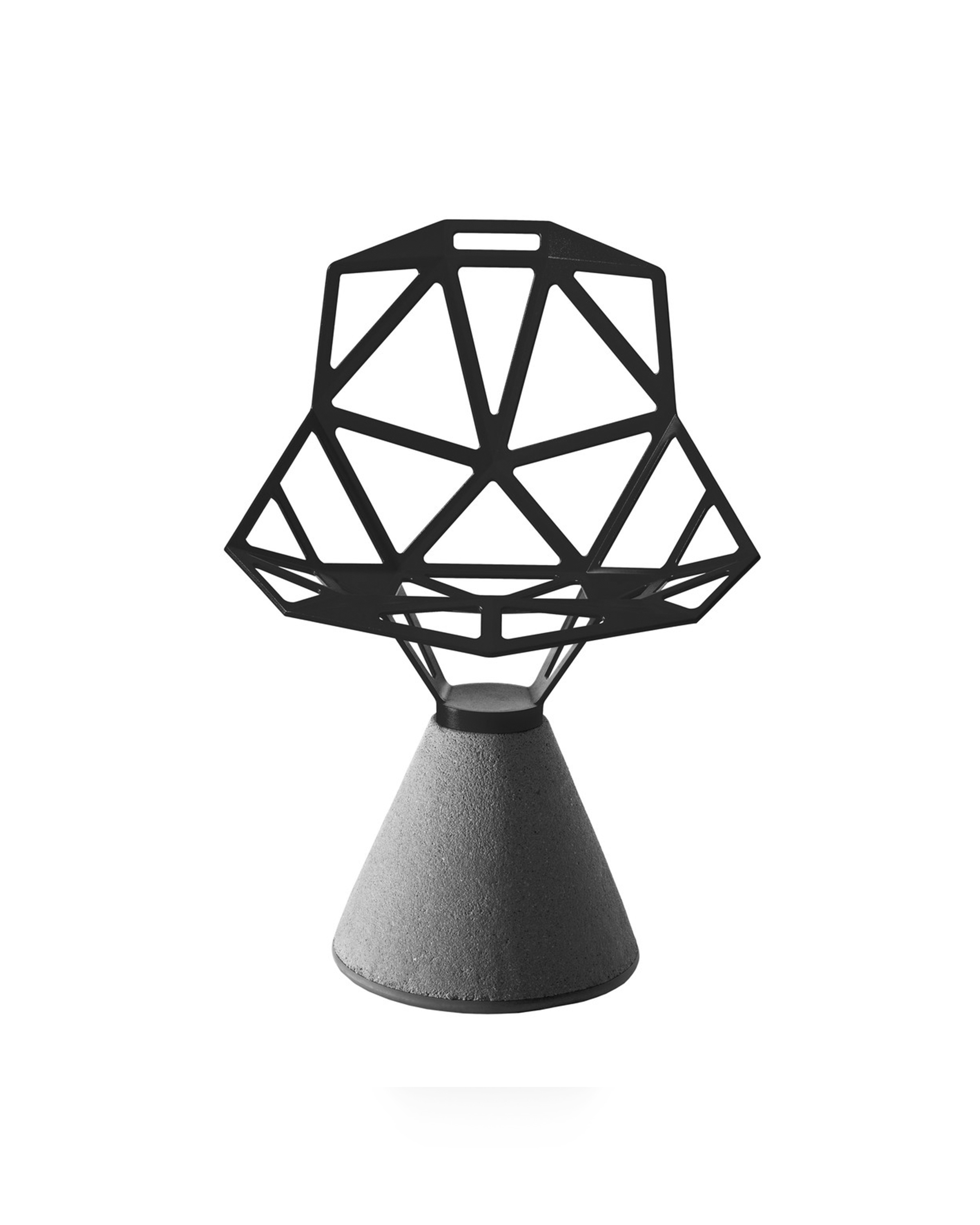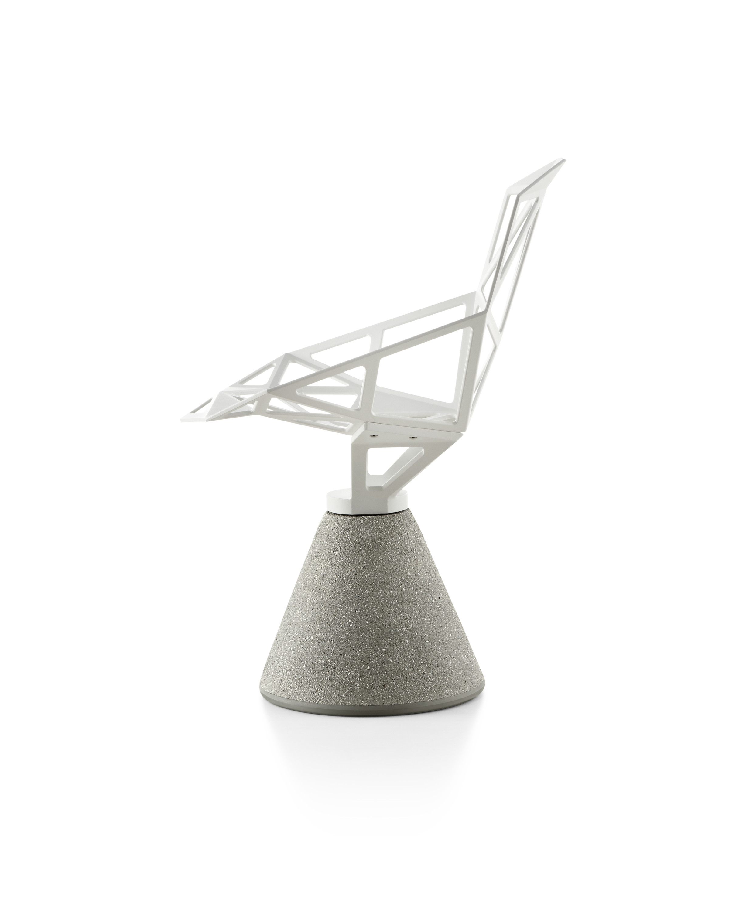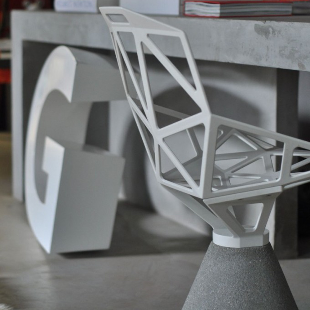 最受瞩目的德国设计师Konstantin Grcic 应邀为MAGIS 设计的Chair One(几何吧椅),是设计生涯中最具有标志的产品之一。办公椅体为模铸铝合金结构,经过氟化钛镀膜与塑料粉末涂布。椅子具有阻燃性、抗腐蚀性。适合室内及室外使用。以铝金属与钛金属制成的 Chair One,以多个平面以不同角度组合而成,建立起立体的外型。多个中空的三角型组合而成的座椅,不但令为用家带来强而有力的承托结构,而且还能在简单设计之中带出不一样的风格。这把椅子的惊人形象难免使人对它的舒适度产生疑问,但当你真正坐于其上,你会发现它实际上非常舒适,那些稀疏的网状结构能够极好地支撑不同体型的人体,后背上的把手也非常实用。当你知道Chair-One最初是被当作户外用椅而设计的,你会更加佩服Konstantin Grcic的缜密用心:极少的表面可以杜绝雨水,并且减少灰尘堆积,夸张的形态则令它能够在街道、建筑或自然的环境中拥有自己美学上的存在,而不是被环境所吞没。Konstantin Grcic花了三年时间设计Chair One,自2003年诞生以来,堪称Grcic精简主义风格的代表作。2006年,Chiar One为Konstantin Grcic赢得了德国政府的设计大奖。
