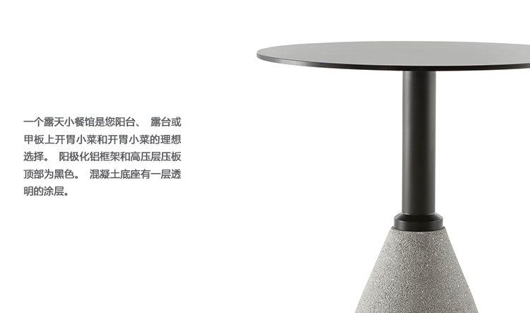 一个露天小餐馆是您阳台、露台或甲板上开胃小菜和开胃小菜的理想选阳极化铝框架和高压层压板顶部为黑色。混凝土基座有一层透明的涂层。
