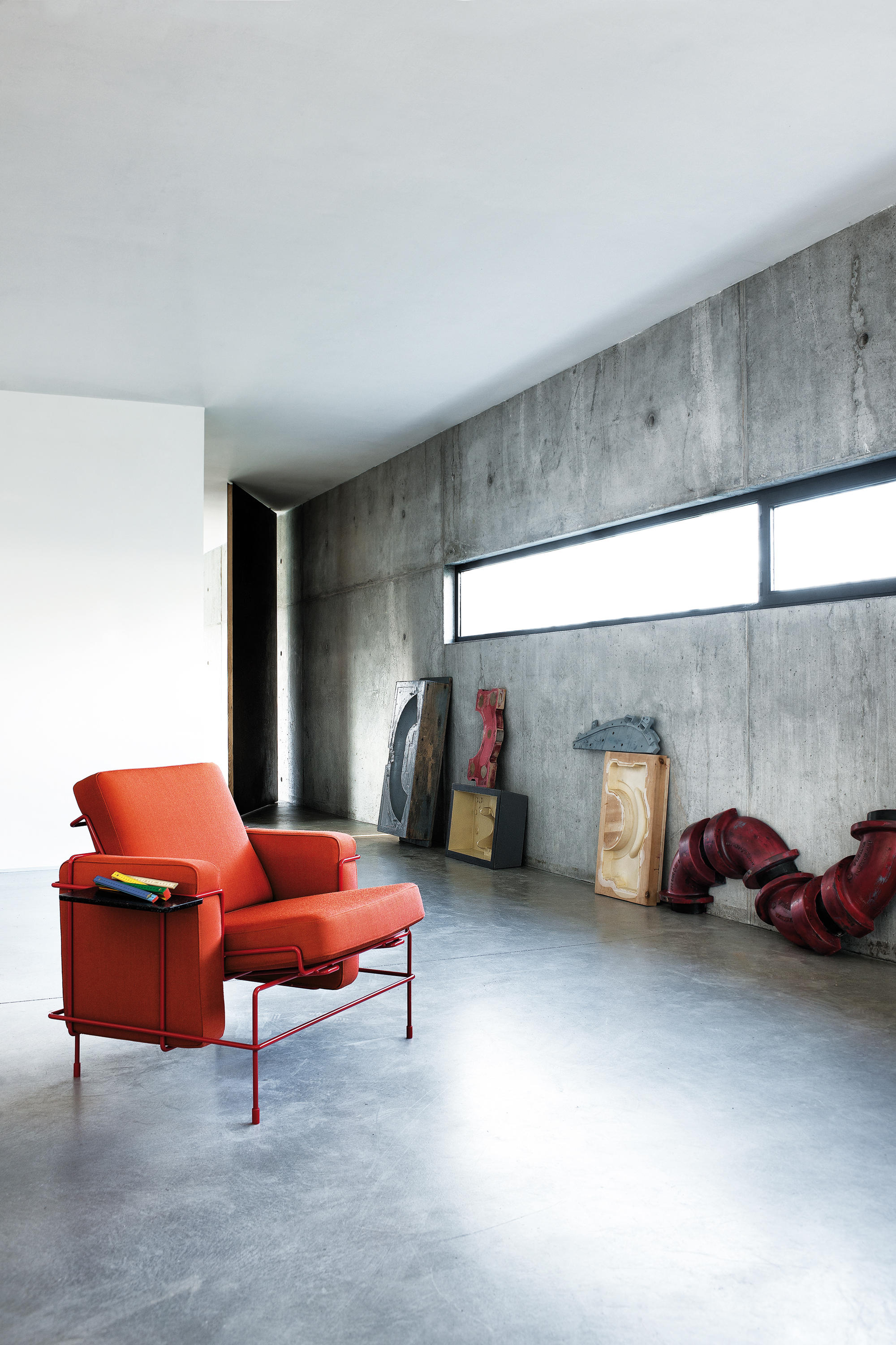 Grcic按比例播放,扩展了交通理念,创造了不同座位形式的词汇:扶手椅,沙发,长椅和躺椅。 后来,他扩展了这个概念,创造了低矮的桌子,可以选择看起来漂浮在角形金属框架上方的石头。
