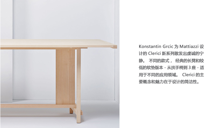 Clerici将慕尼黑设计师Konstantin Grcic的清洁工业美学与Mattiazzi在木材中的最精湛工艺结合起来。这个休息室提供一个扶手椅、一个两个座位和一个三个座位的长椅。细长而稀疏,Grcic解构了传统的座椅形式,木板和空隙之间有着可爱的相互作用。高扶手围绕背部延伸,形成必要的框架,而缺乏完整的背部或侧面则为设计增添了低调的轻盈感。座位上有一个小小的坡度,让您在休息片刻时滑倒。理想的欢迎和过渡地区,Clerici发表了引人注目的声明。