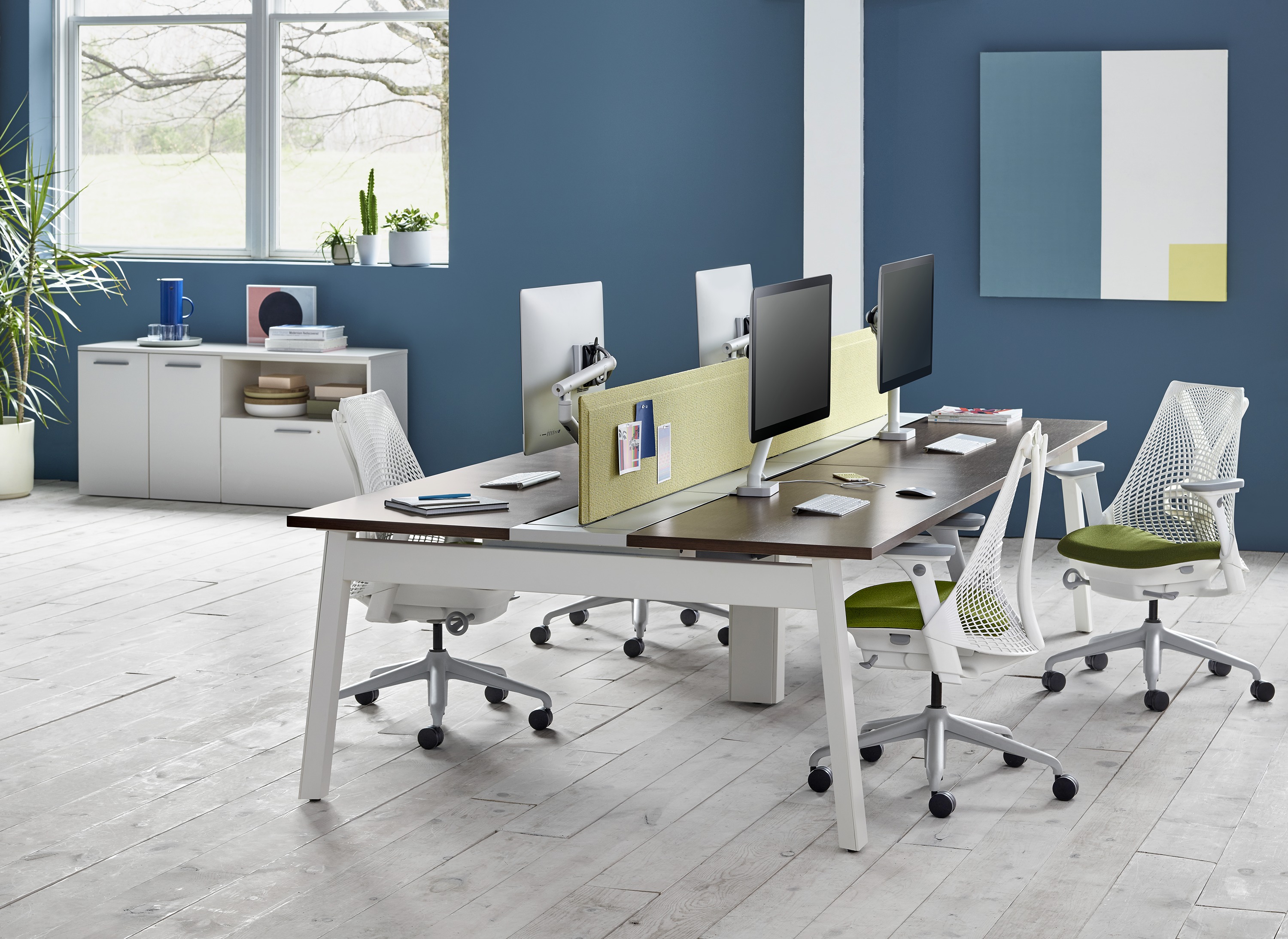 Pari是一个屏幕系列。 有些版本是独立式的,有些版本是贴在表面或框架上的,所有版本都是可粘的,并且共享无框架,薄的外形。 它们一致的细节和互补的颜色有助于美学的连续性,因为它们描绘了空间并提供了隐私。 Pari Screens与许多Herman Miller产品兼容,可在办公室环境中进行设置。 使用Pari Screens,组织可以压缩工作站并在较低的墙壁高度进行标准化,而不会牺牲员工所需的隐私,以便他们可以集中注意力,或创建个人空间的边界让他们感到舒适。
