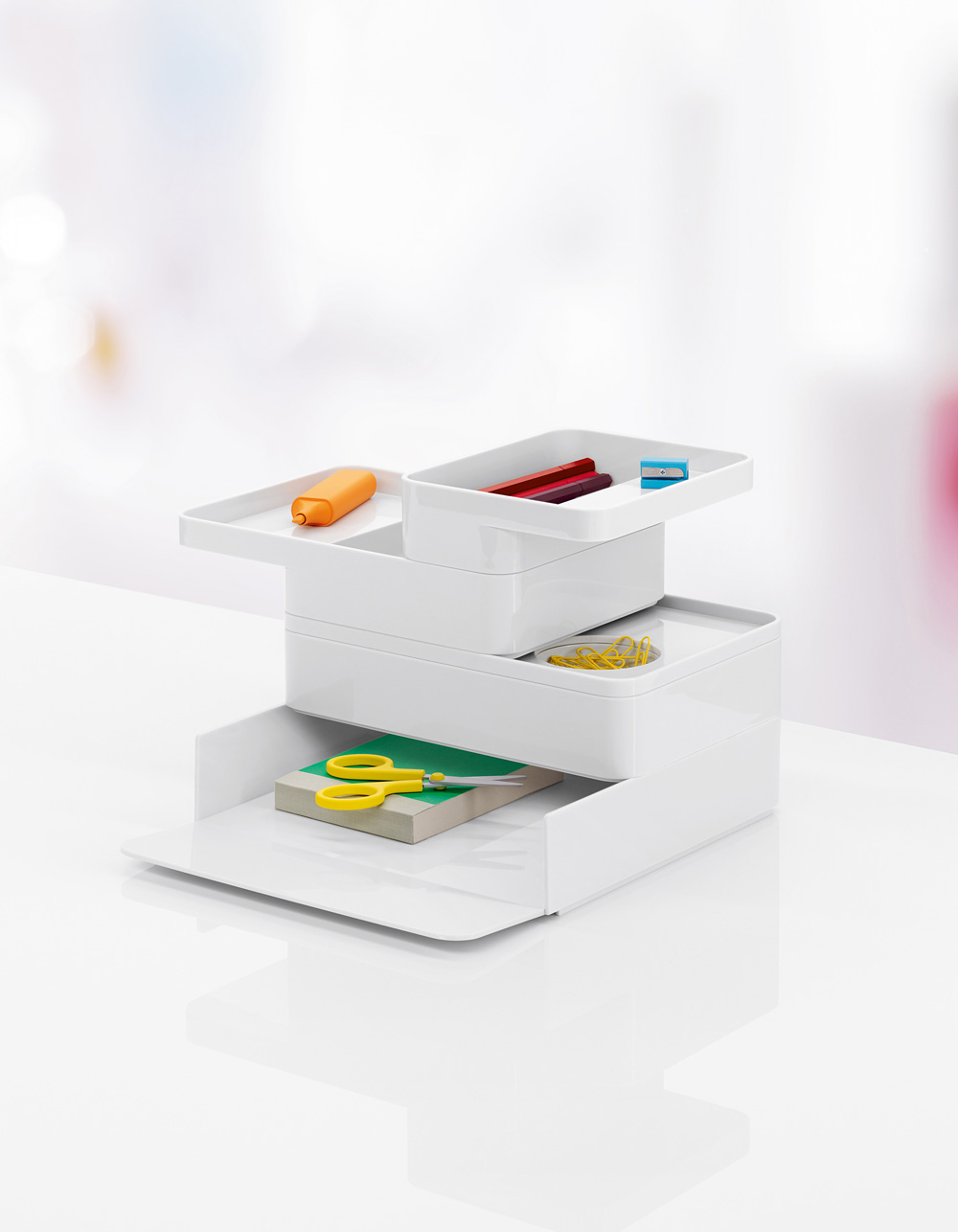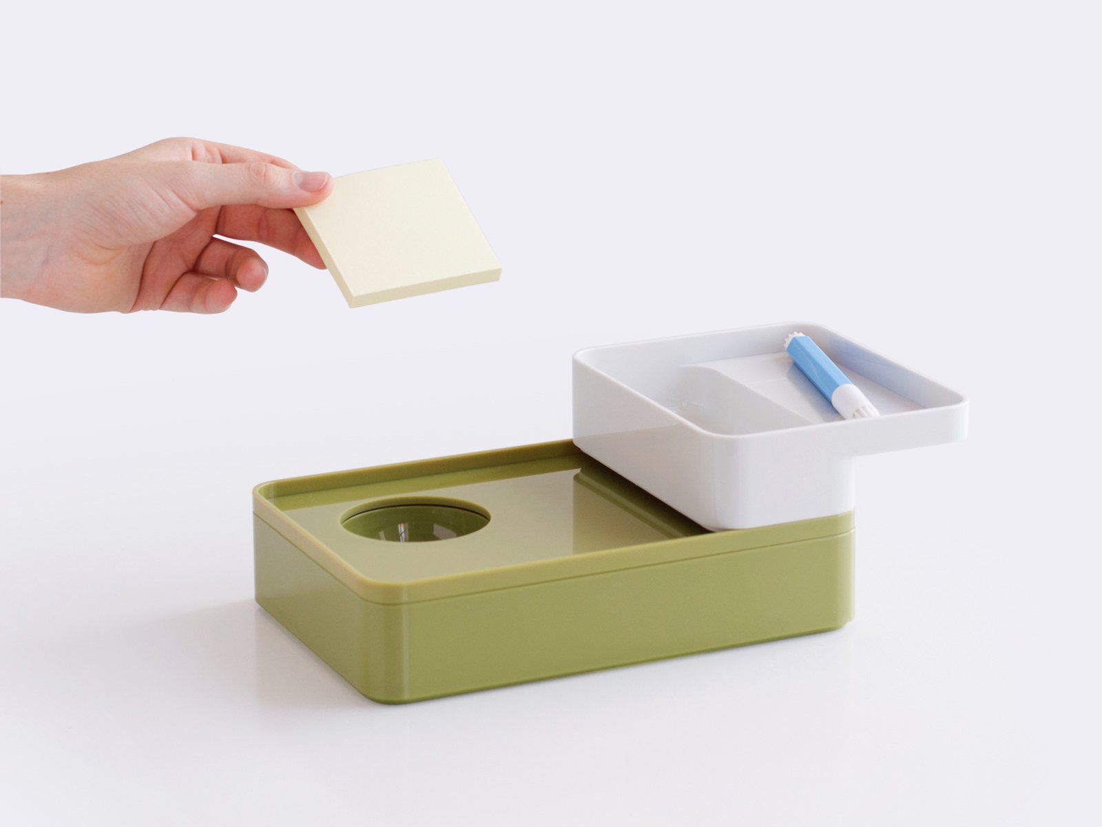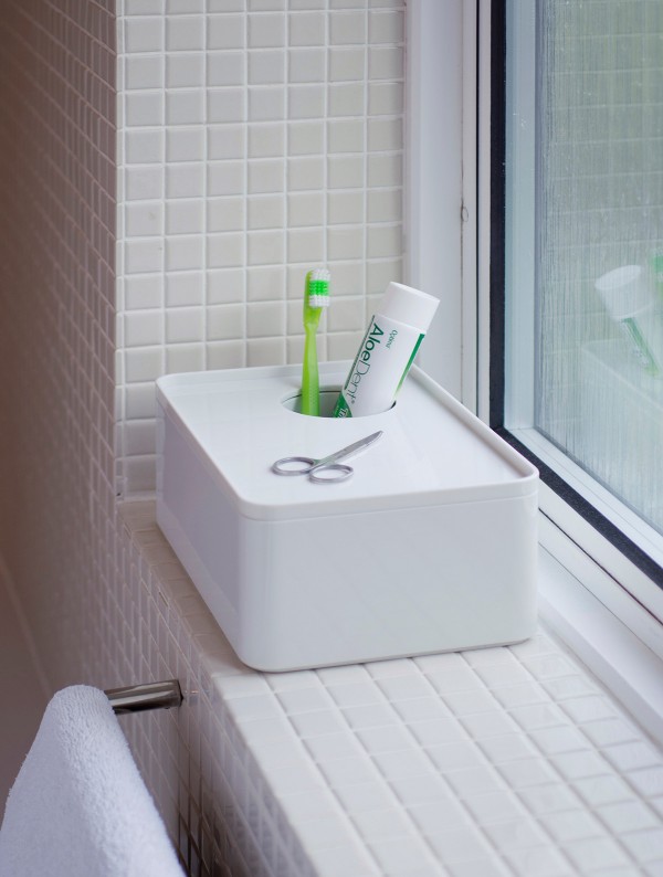 考虑到占据家庭及办公室空间的笨重物品的存放问题,Sam Hecht和Kim Colin设计了具有可拆卸盖子的储物盒。每个盖子上设计有孔洞,可供放置移动式笔筒。或者,笔筒可固定于储物盒内部孔洞下方压槽中,从而在无需打开盖子的情况下便可接触杯中物品。