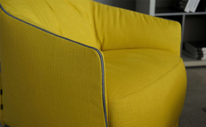 "The Santa Monica Lounge armchair,characterized by a unique design,is a project conceived by the French designer Jean-Marie Massaud,and it is produced by Poliform,a leading company in the made in Italy furniture manufacture.The Santa Monica Lounge armchair on sale in our showroom is matched with the Santa Monica ottoman.Both the items are covered in fabric,yellow colour,with iron coloured stitches."