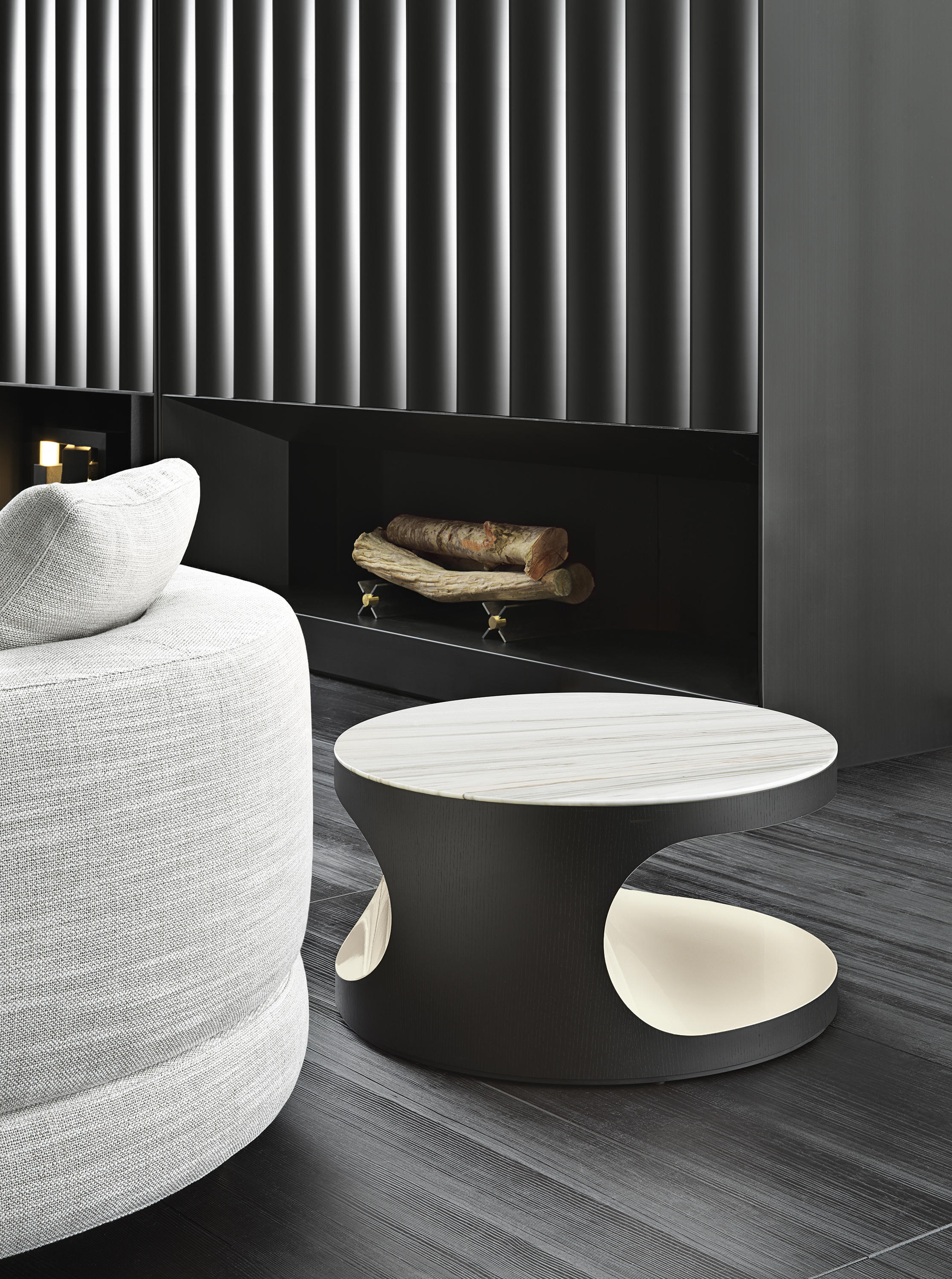 Boden有两种不同的高度和不同的比例,在侧桌版本中更纤细,在咖啡桌的解决方案中更紧凑,Boden被黑色的pate de verre或Zebrino大理石覆盖。