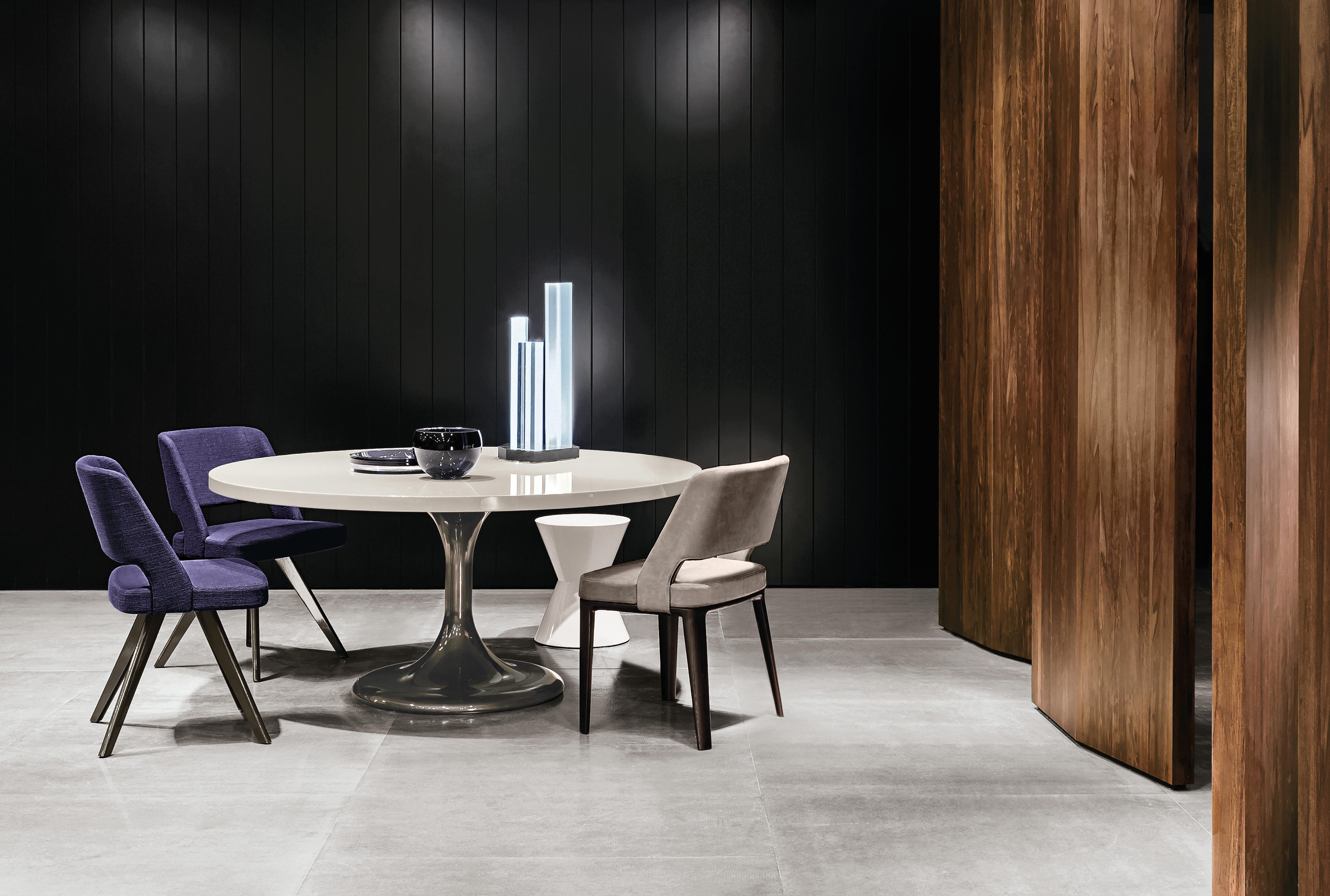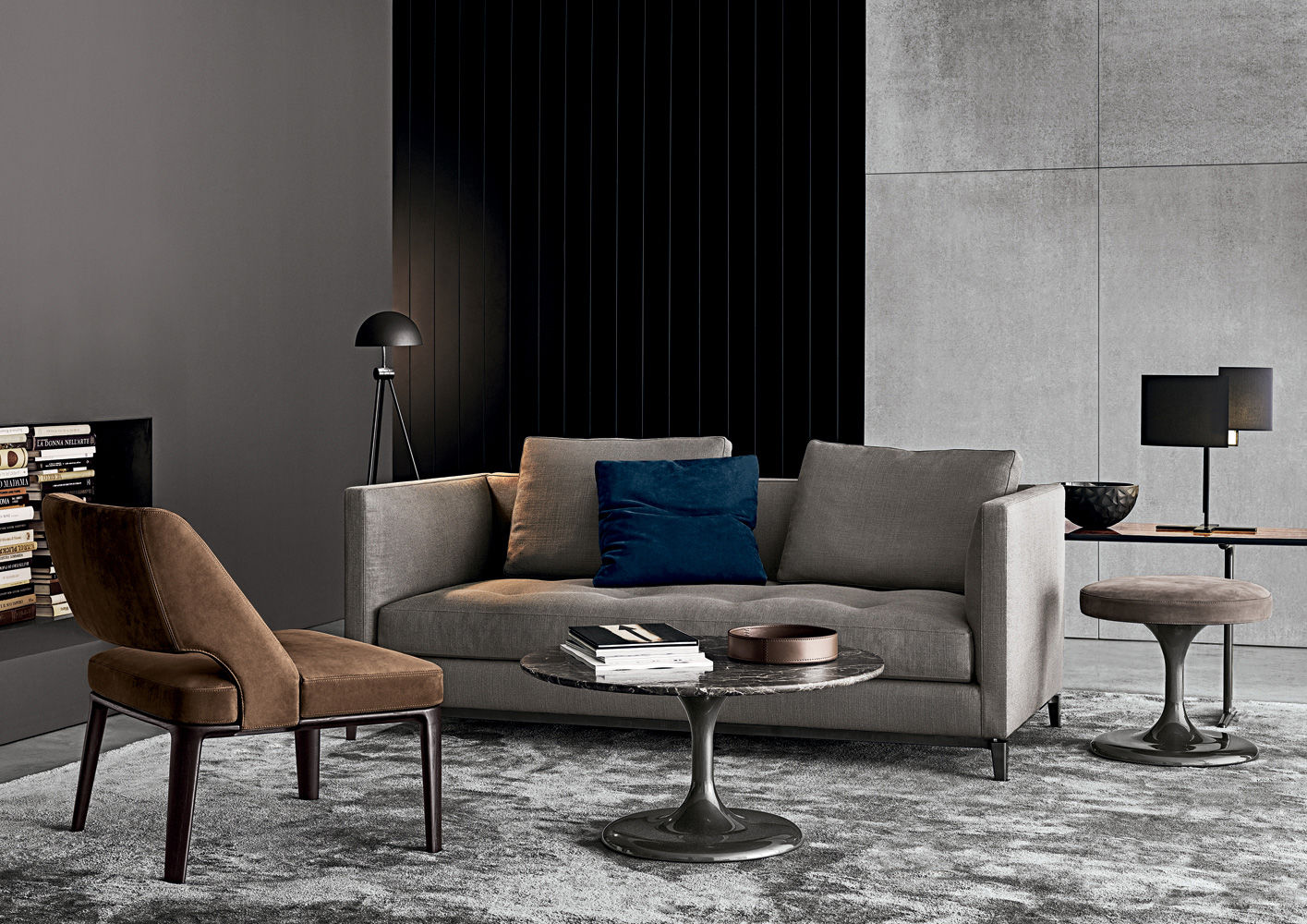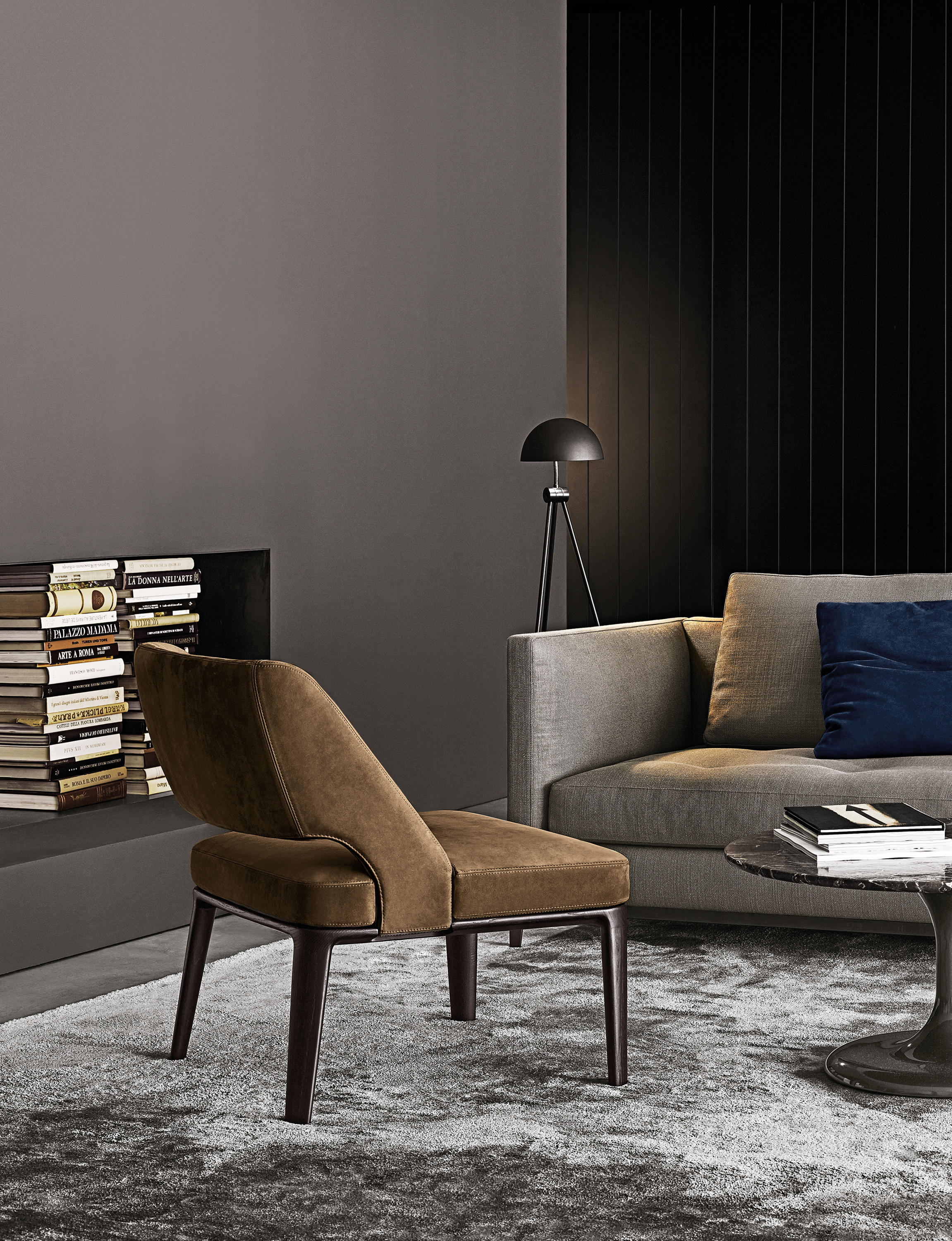 Neto是一组咖啡桌系列,有不同的高度可供选择,此外还有三种直径的台面以及三种不同的材料-颜色组合。如果基座和台面使用相同的颜色亮光漆(白色或Pewter色),以此来展现造型的纯粹感;另外,无论是基座为Pewter色,台面为Marron Damasco大理石的版本;还是基座为白色或Pewter色,台面为亚光漆面的花梨木的版本,两者都强调木材和石材这两种材质的珍贵性。“全白”版本则展现出Neto咖啡桌的可塑性。在亚光漆面的花梨木版本中,台面下方使用与聚氨酯基座相同的颜色,采用Minotti Studio的独家设计。技术与设计内涵在咖啡桌上展露无遗,体现出十足的个性,使其能够搭配系列中的任何沙发座椅。这款极具功能性的休闲凳属于Neto家族,基座材质为聚氨酯,漆面颜色为Pewter色,上方部件则添加填充物,包覆Minotti独家系列中的布料和皮革。Neto休闲凳是搭配LANE边几的理想之选,实际上,它也是一款万能单品,在任何环境中都能自如地展现魅力,与系列中的任何产品搭配都毫无违和感。