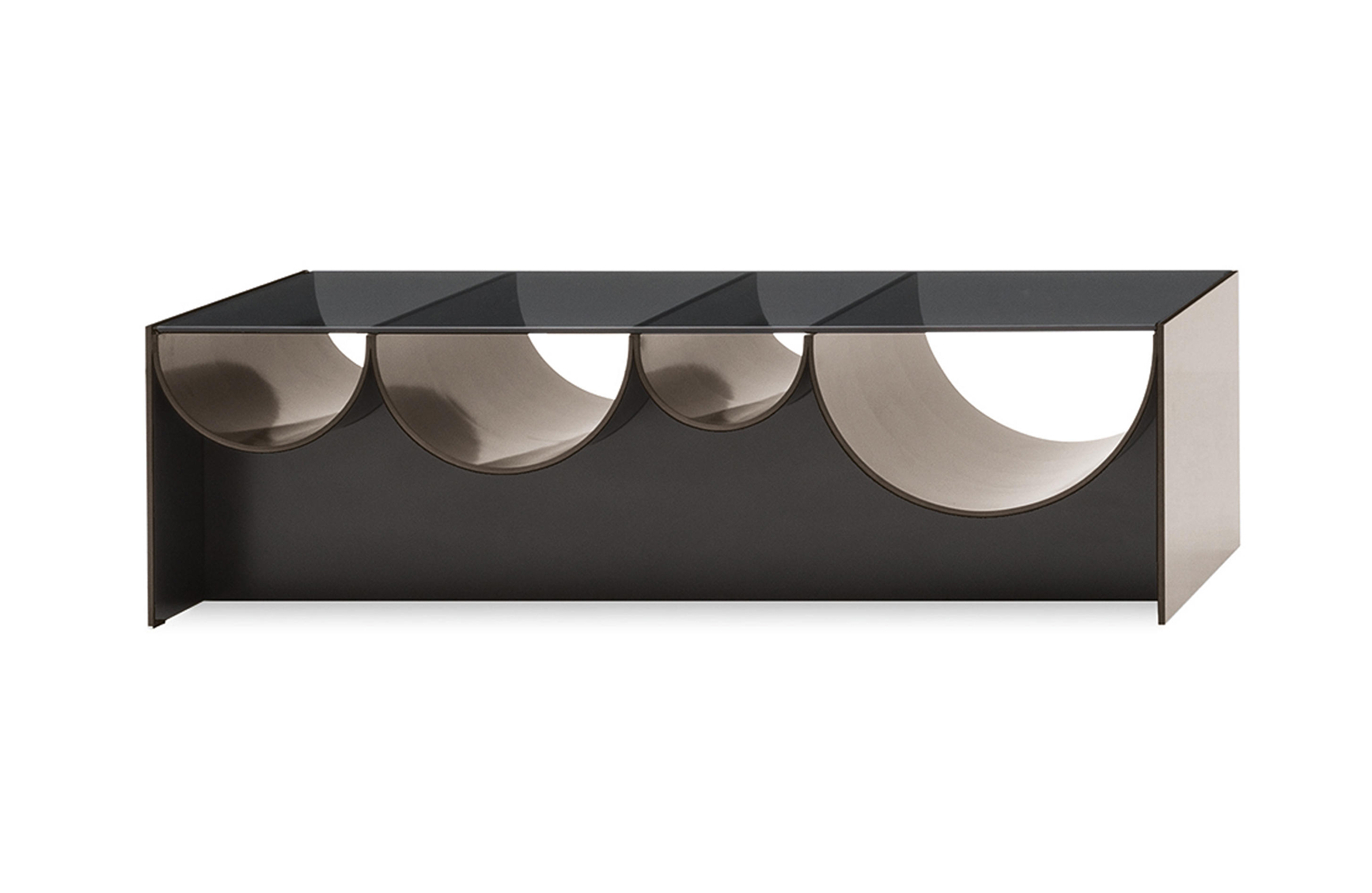 波浪咖啡桌是由一种烟熏的灰色玻璃制成的,它由一种漆成的铝结构支撑着,外面是一种沙子或浅青铜色的色调,里面有一种淡黄色的色调。