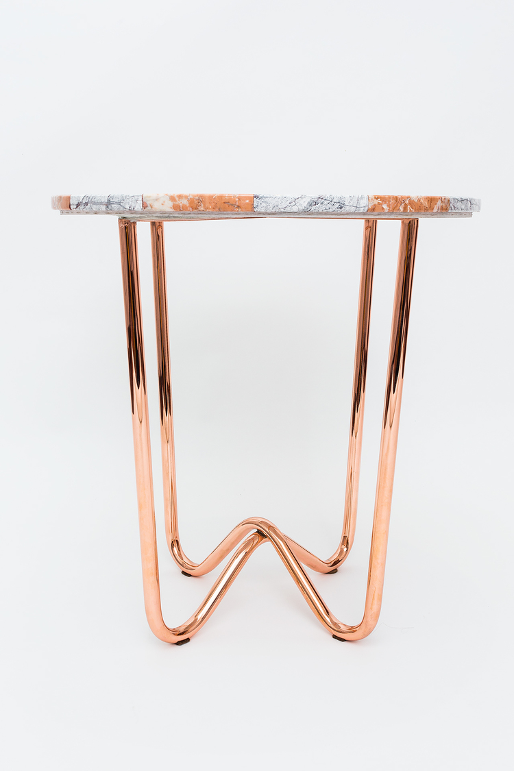“Jasmine Pizza(茉莉花披萨)”结合了两种不同的大理石和对比鲜明的色彩,完全是手工制作,饰有弧形形铜腿。 “Jasmine Pizza”有不同的大理石,腿部饰面和尺码。