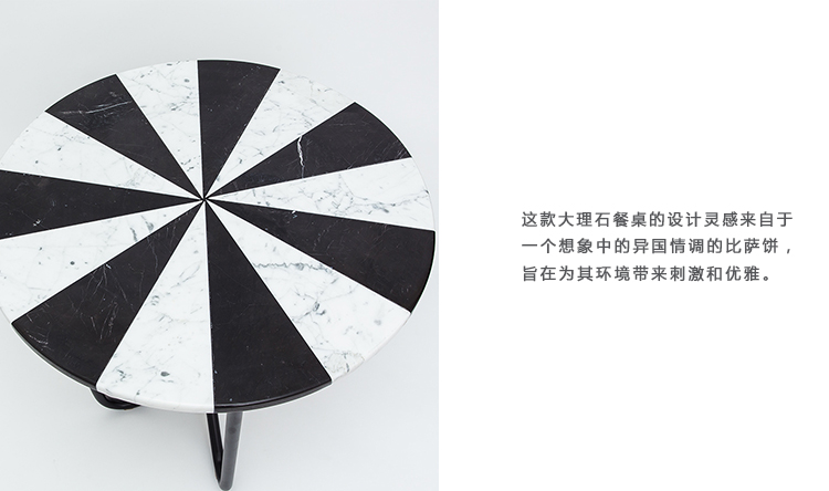 这款大理石餐桌的设计灵感来自于一个想象中的异国情调的比萨饼,旨在为其环境带来刺激和优雅。