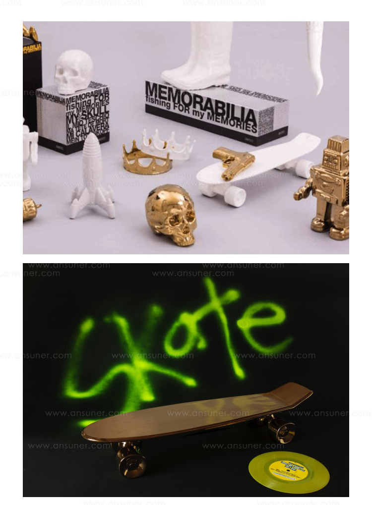 与Memorabilia系列一样,Memorabilia Gold是一系列独立装饰品,让人想起文化或历史事件,这也增加了兴趣点。 “我的滑板”实际上被设计用作食品拼盘,用于寿司或冷肉等食品,体现了Seletti对功能性艺术的热爱!