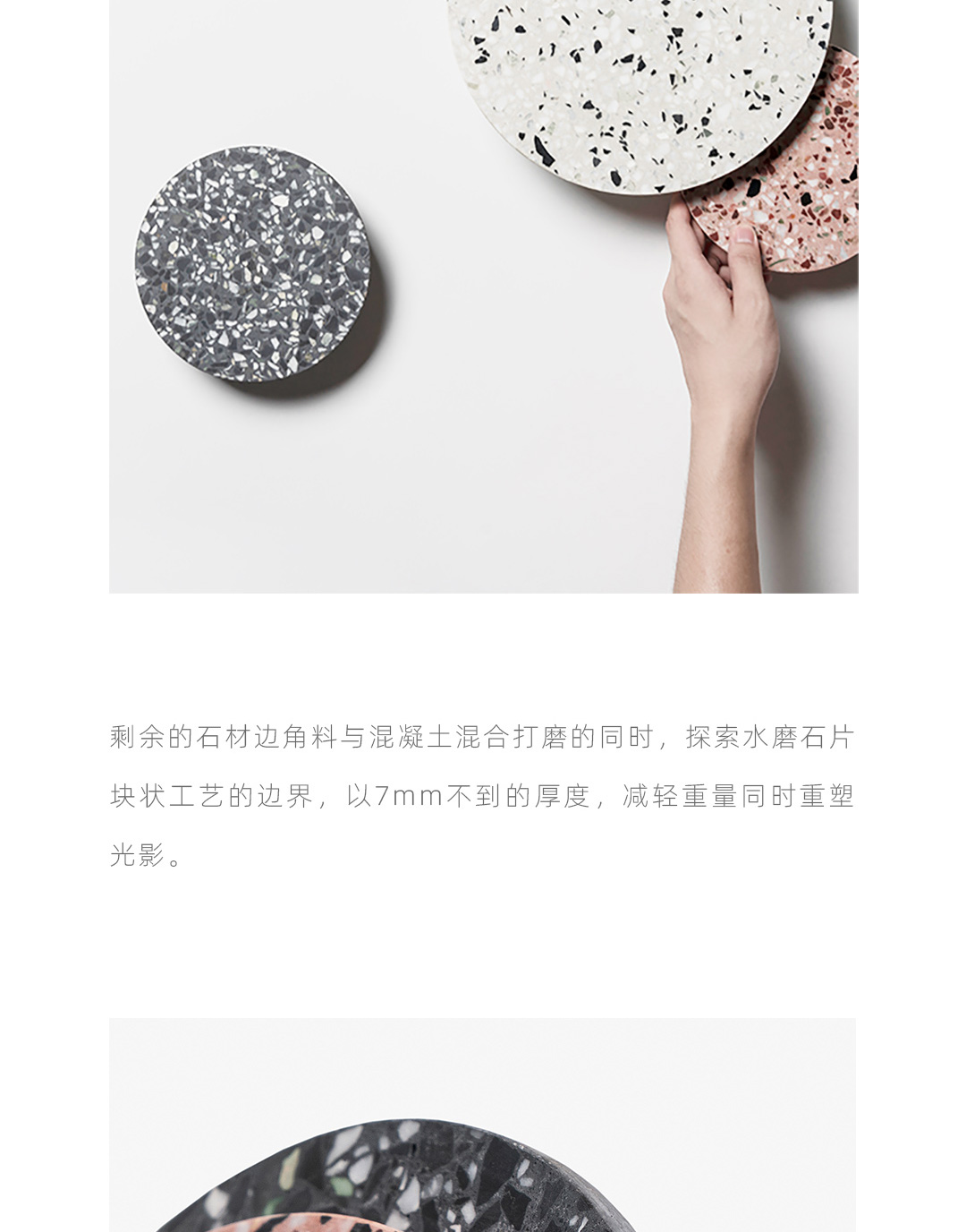 以材质再生为基本手段的水磨石系列,将陶瓷废渣再生成简洁形态的日常性家具,以衍生产业的形式回归到大众层面的使用中。 中国佛山,这片拥有全球最大最成熟的陶瓷产业链和产业集群的建筑陶瓷工厂的土地,承载着每年400万吨陶瓷废弃物带来的环境污染。 以材质再生融入日常,不仅是激发商业价值的大胆尝试,是环保理念的日常化实践,更是对自我尊严的基本坚守和追求,我们探寻陶瓷跨越地域局限的一种当代突破!