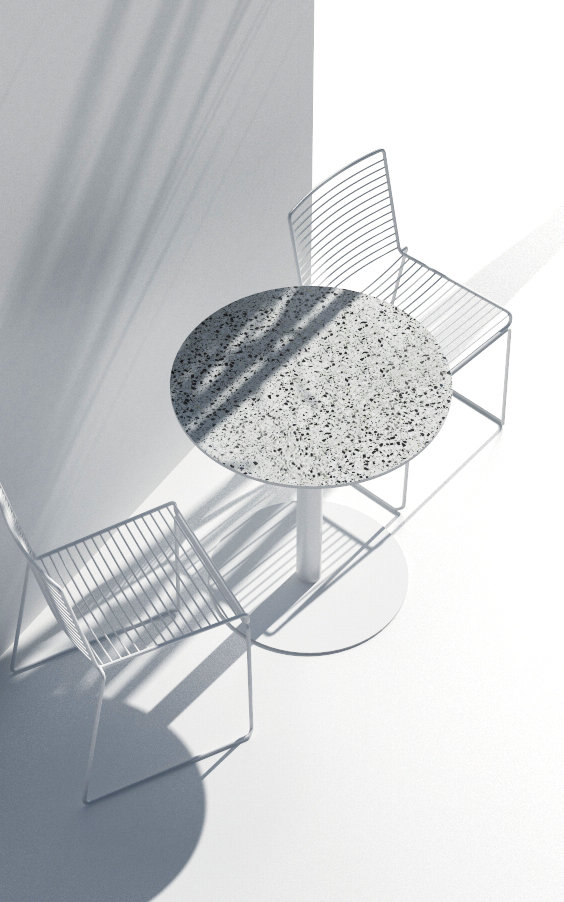 本产品采用了混凝土掺入石英粒的水磨石,随机分布的石英为家具提供了足够的装饰,既简朴又精致。 水磨石板材与支架通过巧妙的结构连结,垂直错开的支架使产品整体更具形式感。 倒角使得整体更具细节,利落的直线,是本土创造追求并相信的简单,和直接的材质表达的手法,没有多余的装饰造型线。
