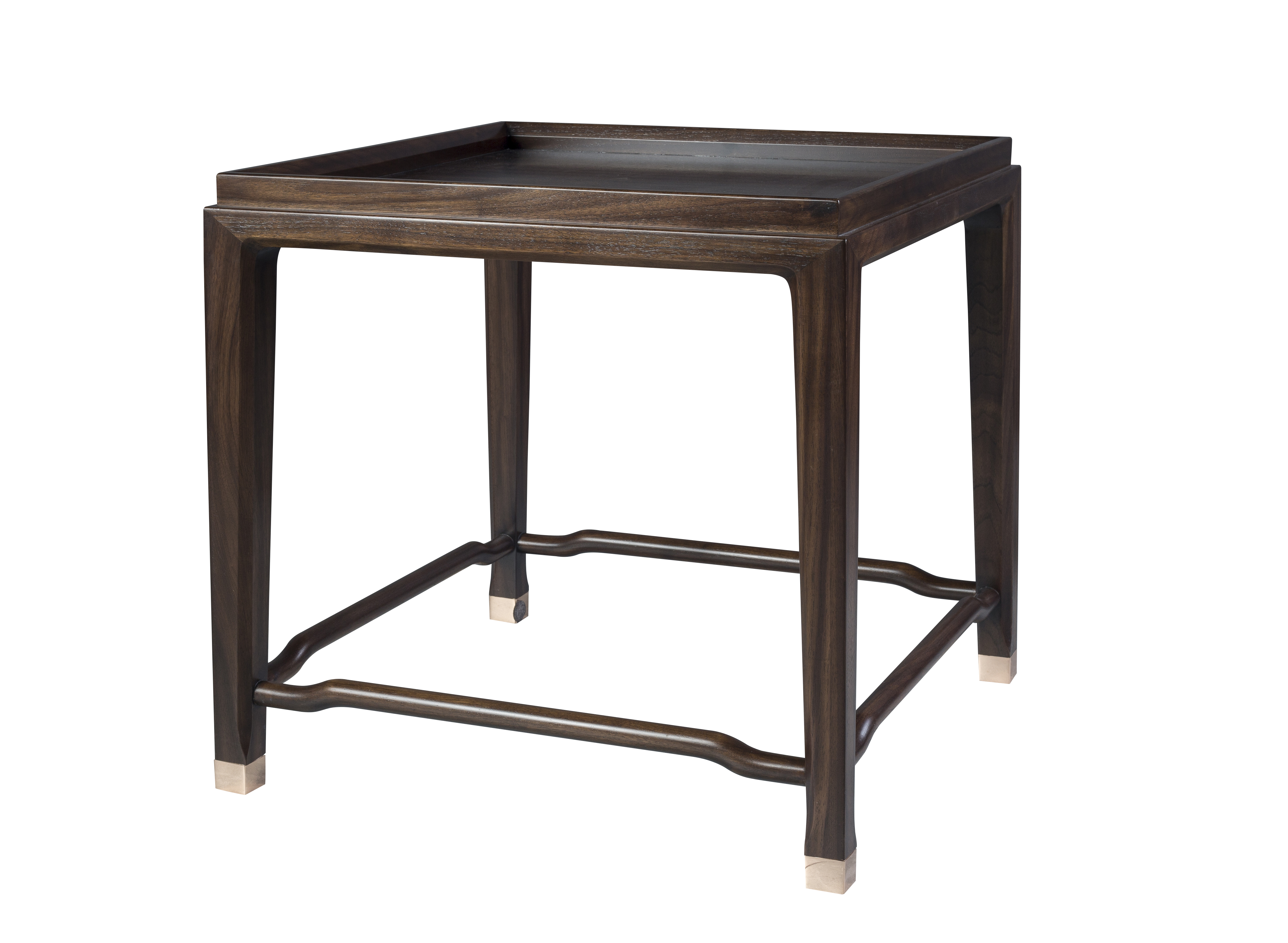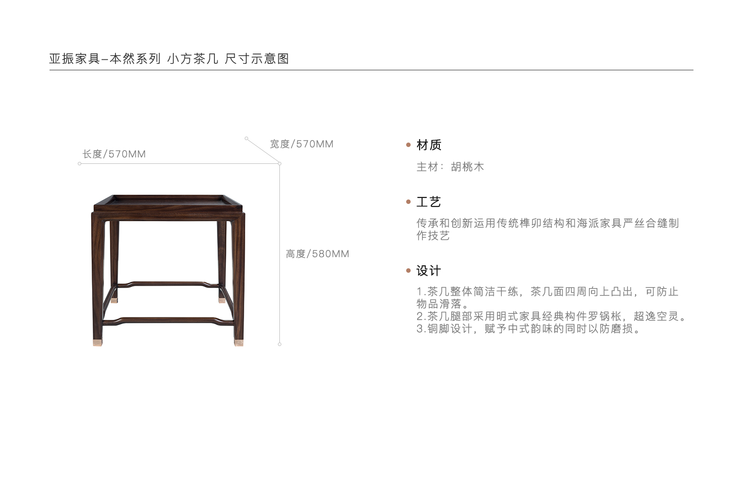 1.茶几整体简洁干练,茶几面四周向上凸出,可防止物品滑落。 2.茶几腿部采用明式家具经典构件罗锅枨,超逸空灵。 3.铜脚设计,赋予中式韵味的同时以防磨损。