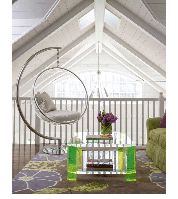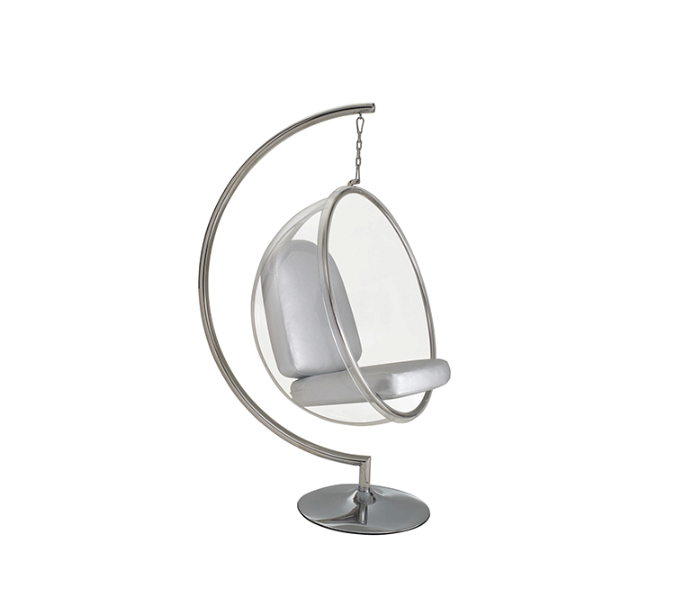 "芬兰家具设计大师艾洛.阿尼奥(Eero Aarnio)在德国品牌Adelta的代表作Bubble Chair(泡泡椅)。灵感来自于Ball Chair,但尺寸略小,而且椅子是以压克力制成,光线可以从四面八方透进。压克力加热充气,使它成为皂泡状,加入一个钢圈和椅垫即成。这样一组貌似轻巧的家具,但却能负重至少200公斤以上,由天花板垂链将Bubble吊起,宛如漂浮于空气中的泡泡一般!洁净面透明!带着科技感的椅子,又像置身于太空中,未来感十足。摆脱了椅子就是要放在地板上的刻板印象。最适合为摄影背景之用。坐在这把椅子上,即使身处一个拥挤的空间,也有点遗世独立的奇妙感觉。挪威一家电话公司在总公司入口大厅吊了几把这样的椅子,让客户可以在打行动电话时,有个宁静的空间。这件作品在1966年的科隆家具博览会上一举成名。