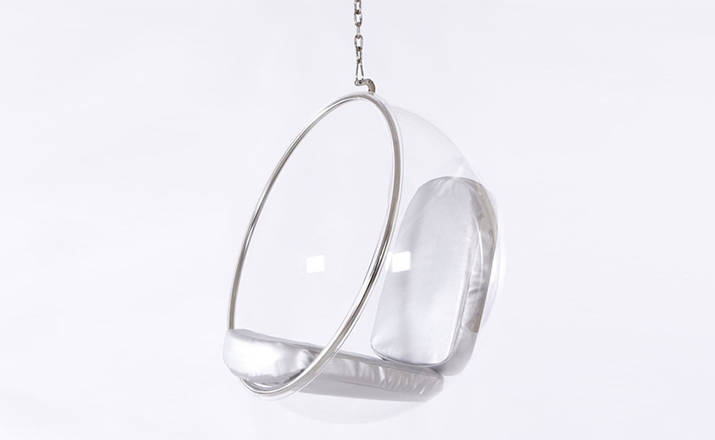 "芬兰家具设计大师艾洛.阿尼奥(Eero Aarnio)在德国品牌Adelta的代表作Bubble Chair(泡泡椅)。灵感来自于Ball Chair,但尺寸略小,而且椅子是以压克力制成,光线可以从四面八方透进。压克力加热充气,使它成为皂泡状,加入一个钢圈和椅垫即成。这样一组貌似轻巧的家具,但却能负重至少200公斤以上,由天花板垂链将Bubble吊起,宛如漂浮于空气中的泡泡一般!洁净面透明!带着科技感的椅子,又像置身于太空中,未来感十足。摆脱了椅子就是要放在地板上的刻板印象。最适合为摄影背景之用。坐在这把椅子上,即使身处一个拥挤的空间,也有点遗世独立的奇妙感觉。挪威一家电话公司在总公司入口大厅吊了几把这样的椅子,让客户可以在打行动电话时,有个宁静的空间。这件作品在1966年的科隆家具博览会上一举成名。