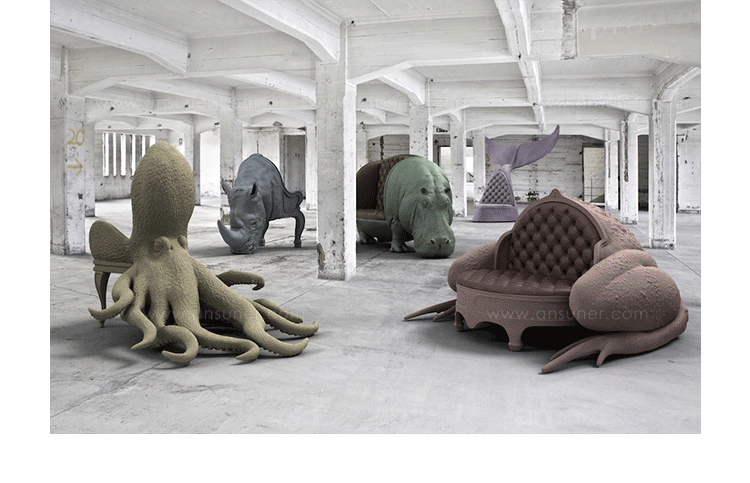 西班牙设计师 Maximo Riera 设计了一组包括章鱼、犀牛、海象、狮子等在内的 15 件动物造型座椅系列皮椅。这个系列的动物椅集合了不同的物种,从哺乳动物到爬行动物,甚至包括昆虫。每个设计都保留了动物的自然活力,同时又准确还原动物的外观特征。这些动物椅的初衷是一种尝试,希望以动物的栖息来反映和捕捉大自然的美,并向我们星球上的整个动物王国致敬。设计师除了表现动物的野性美,也在善意的提醒人们要维持生态的平衡,尤其对濒危物种多加关注,以实现人与自然的相互依赖和谐共存。Whale Chair(鲸鱼椅)是他之前一个系列家具作品的延续。这一系列作品将家具和动物结合到一起,每件家具的主要部件都装饰有一种动物。Whale Chair(鲸鱼椅)把我们带到海洋的深处,这头漂亮的海洋哺乳动物在这里拥有至高无上的统治权。由于该艺术家与海洋千丝万缕的联系,因此对他来说,这种对世界最大动物——蓝鲸——的致敬方式极其重要且具有深刻的意义。这个标志性的图标已被公认为动物王国和人类之间和谐的象征。同时,它还是生存和克服困境的坚强呐喊。鲸鱼椅是设计放置于室内中央的产品。它的的大小和尺寸非常适合放在开阔的空间和宽敞的区域。完全展开的鲸鱼两鳍之间采用了非对称设计。顶端部分向后倾斜,并从动态的角度来实现该作品的平衡匀称。这种鲸已濒临灭绝,因此至关重要的一点是,我们要将负责任、可持续捕鱼的重要性谨记于心,以减缓地球上海洋动物的继续减少。“恐惧源于无知”——赫尔曼·麦尔维尔《白鲸》。