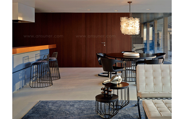 Blending sloping angles and taut lengths of bent metal are a modern interpretation of the wiry idea initially conceived by Warren Platner.The series is made up of a suite of wire tables,side tables and benches and fitted with luxurious solid wood tops.
