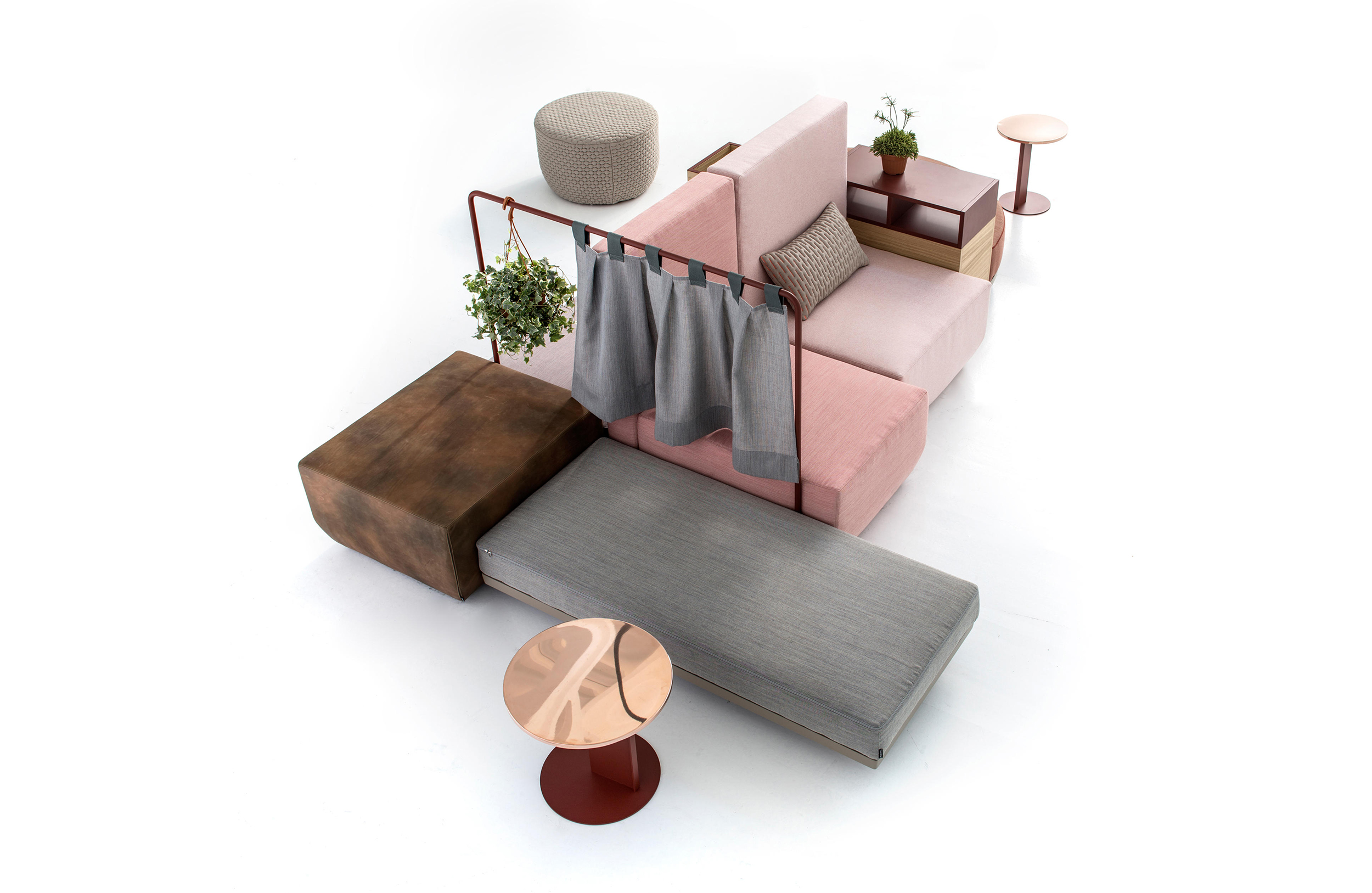 设计相互作用,轨迹控制空间。比基尼是一种风景,它是时代的产物,是它所代表的社会。无论是在等候区还是在家中使用,座位系统是绝对灵活的,因为不需要空间的布局和座位组件的排列。这些组件在外观和功能上各不相同,因此,它们可以在任何设置中使用。凳子、桌子、衣架、容器、架子、屏风、工作台、座椅:每一个元素都结合在一起,创造互动和交流。多种功能和含义的结合意味着沙发作为看电视的家具或简单的休息场所的概念发生了革命性的变化,使它成为互动的核心。