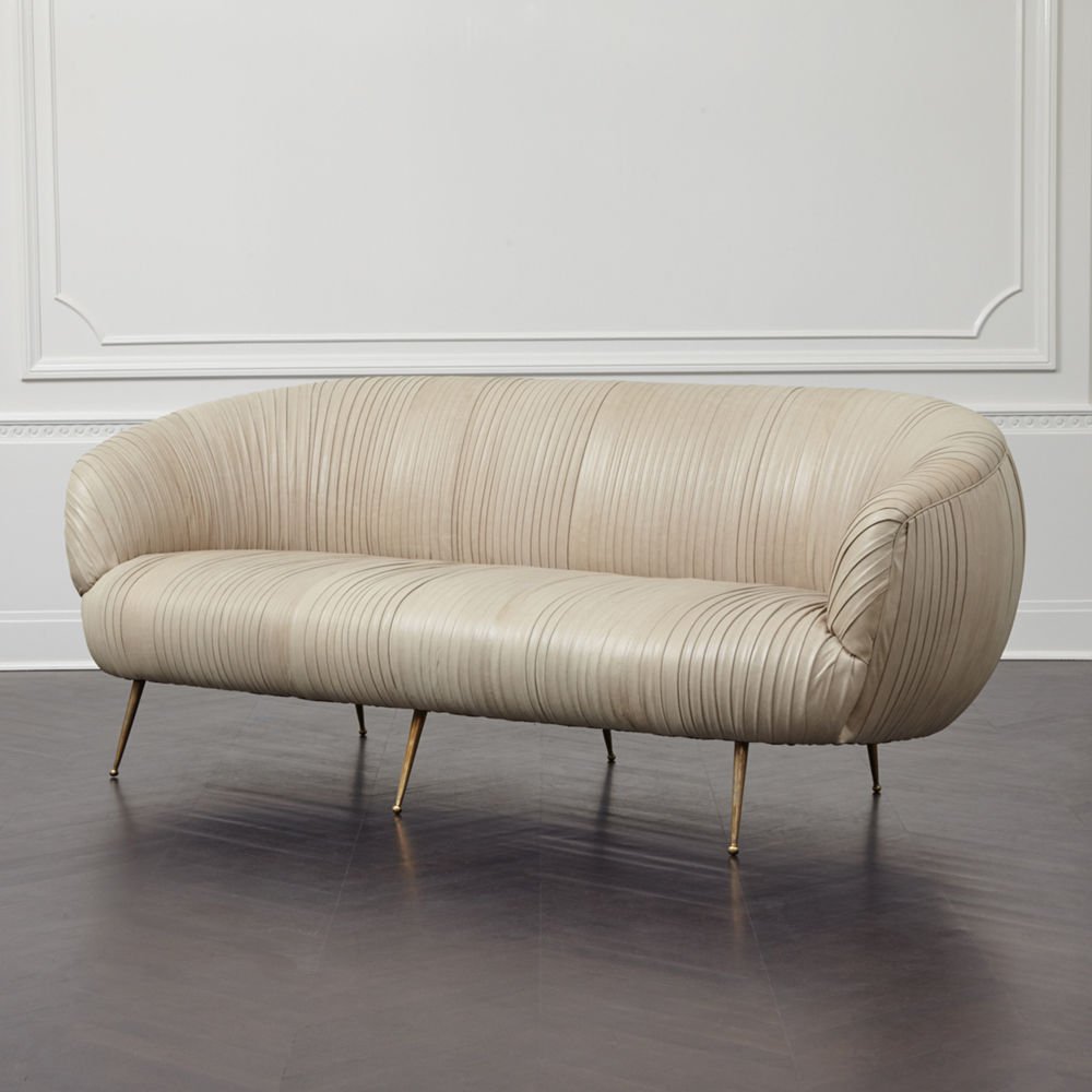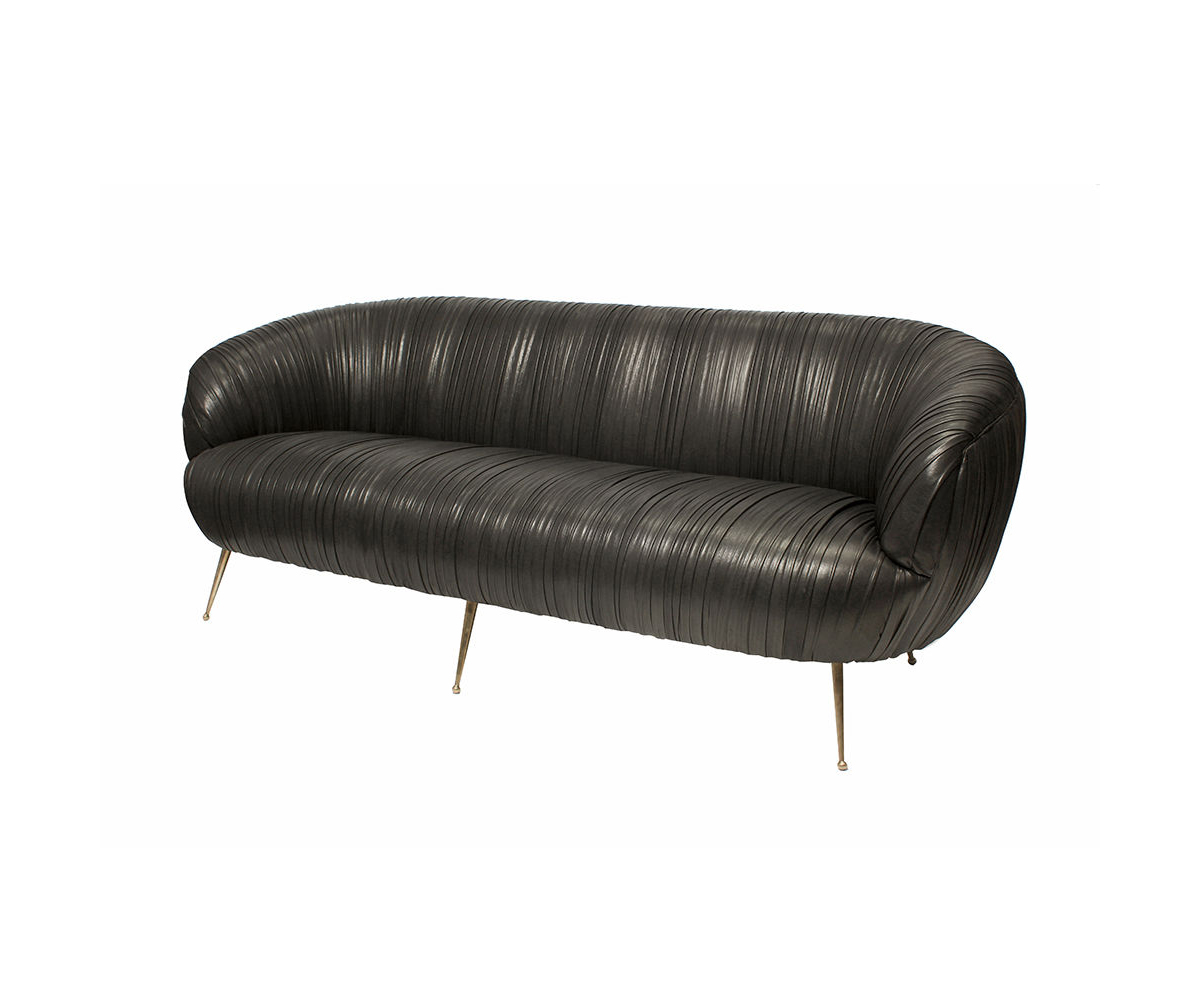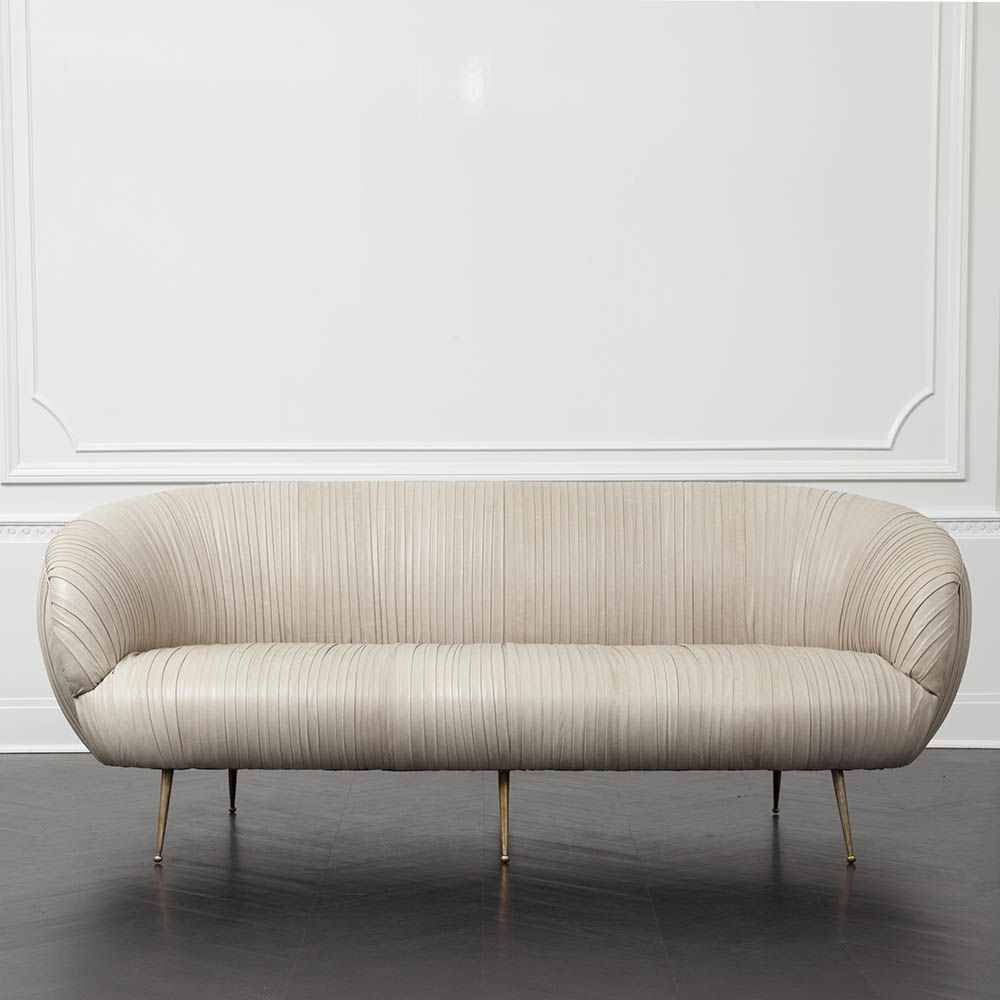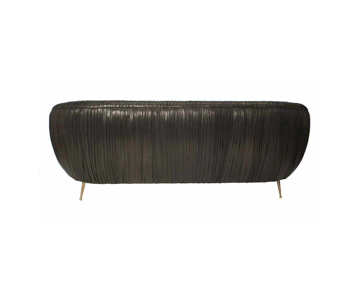 这款沙发的精致线条采用标志性褶皱皮革细节设计。 窑干硬木框架采用双榫和胶合,配有8向手工弹簧。 全面的蔬菜染色小羊皮手工缝制在框架上。 这款精致细腻的豪华沙发坐落在坚固的青铜铸造的锥形腿上。 完美适合厨房长椅,客厅或床边。