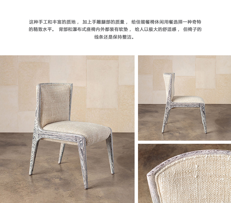 这种手工和丰富的质地,加上手雕腿部的质量,给佳能餐椅休闲用餐选择一种奇特的精致水平。背部和瀑布式座椅内外都装有软垫,给人以极大的舒适感,但椅子的线条还是保持整洁。可供选择的精品面料和皮革。