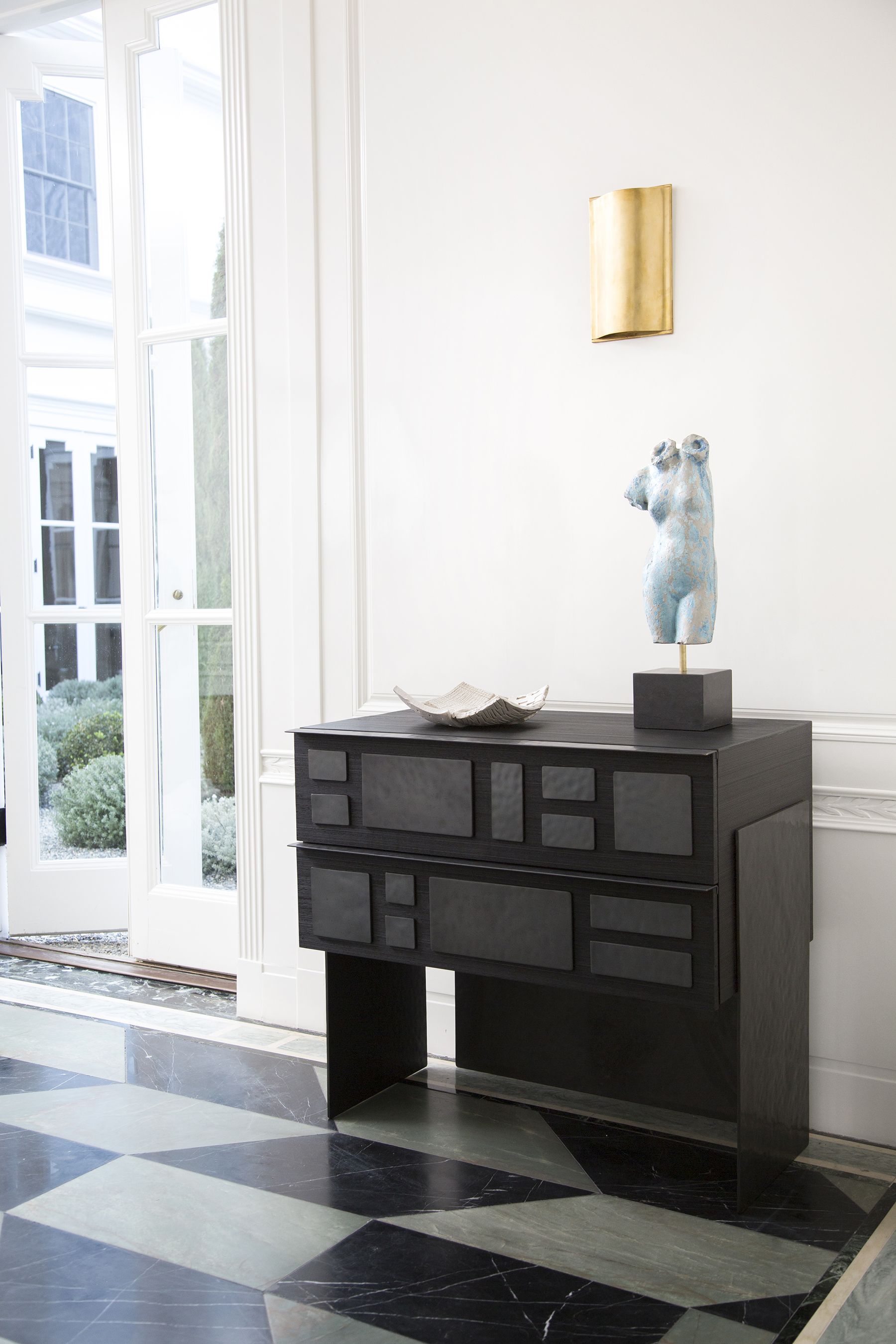 细腻的罗纹与Hyperion玄关柜的深层乌木饰面相结合,赋予这款柜子醒目的轮廓。 每块铸造黄铜都有手工锤打纹理和光泽的黑色饰面。 两个深抽屉在软关闭硬件上滑出。 这款柜子可以很容易地作为床头柜或配置在一个戏剧性的入口通道。
