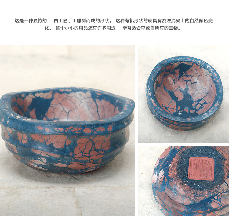 这是一种独特的,由工匠手工雕刻而成的形状。 这种有机形状的碗具有浇注混凝土的自然颜色变化。 这个小小的用品还有许多用途,非常适合存放你所有的宝物。