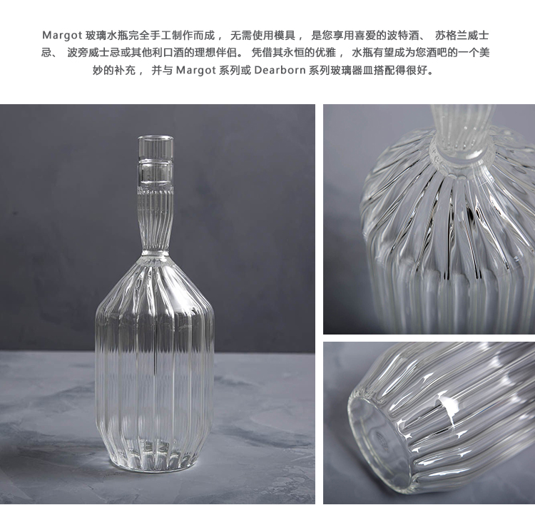 Margot玻璃水瓶完全手工制作而成,无需使用模具,是您享用喜爱的波特酒、苏格兰威士忌、波旁威士忌或其他利口酒的理想伴侣。 凭借其永恒的优雅,水瓶有望成为您酒吧的一个美妙的补充,并与Margot系列或Dearborn系列玻璃器皿搭配得很好。