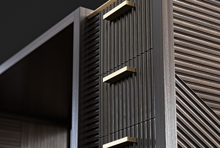 凭借其功能性设计,这款灵活的复古风格橱柜营造出简约的几何形状,并在完整空间和空间之间实现完美平衡 典型的表面处理采用交织的橡木编织,手工打磨和涂漆,具有极佳的视觉冲击力。