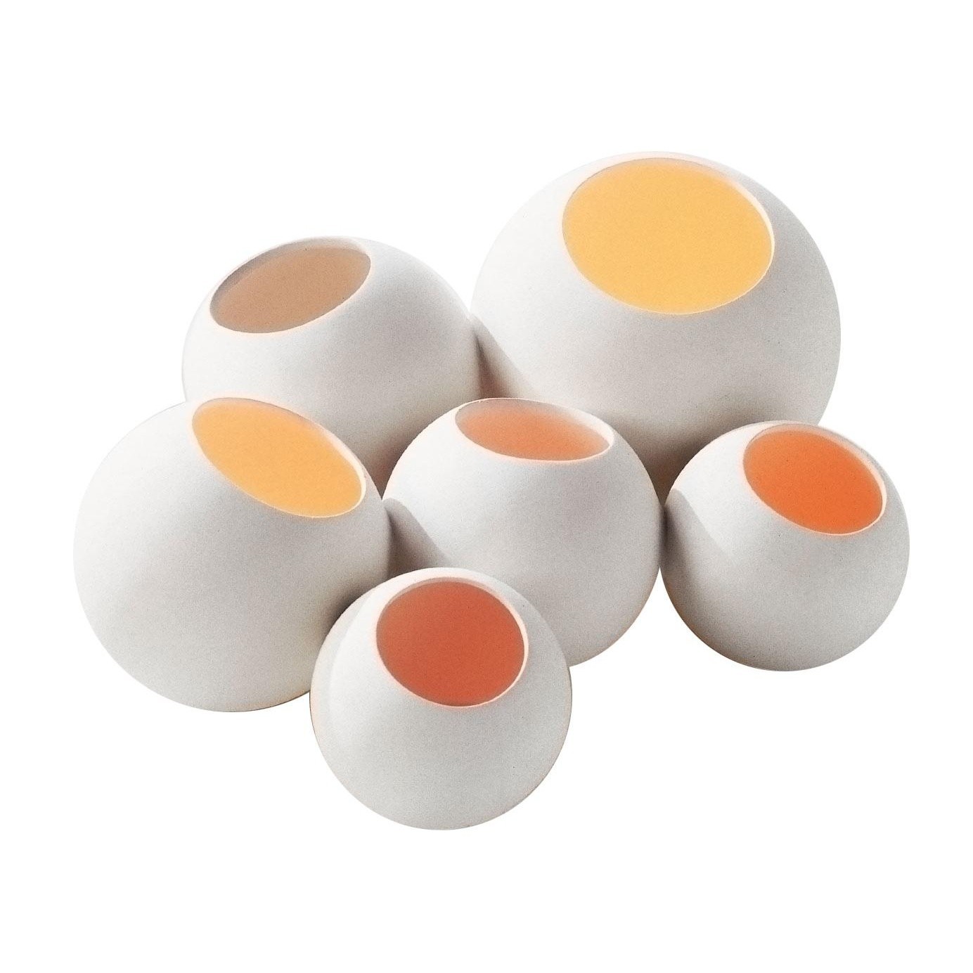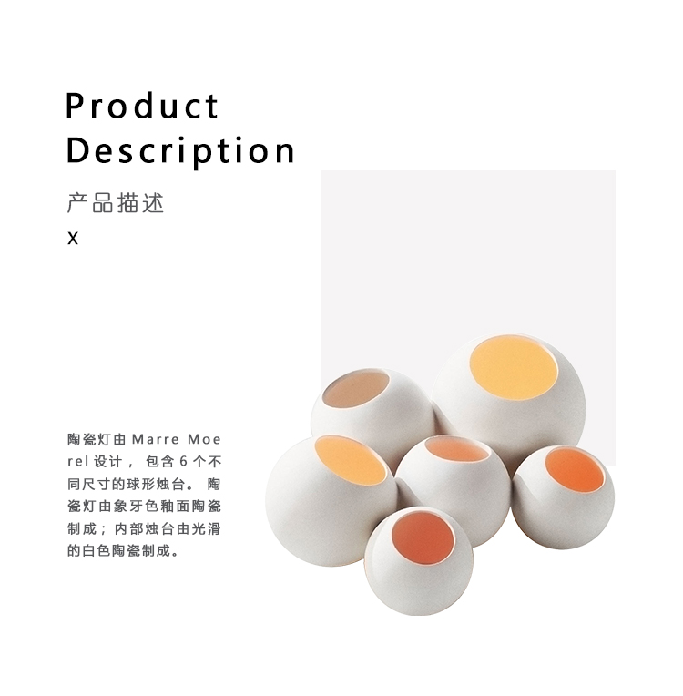 陶瓷灯由Marre Moerel设计,包含6个不同尺寸的球形烛台。 陶瓷灯由象牙色釉面陶瓷制成; 内部烛台由光滑的白色陶瓷制成。