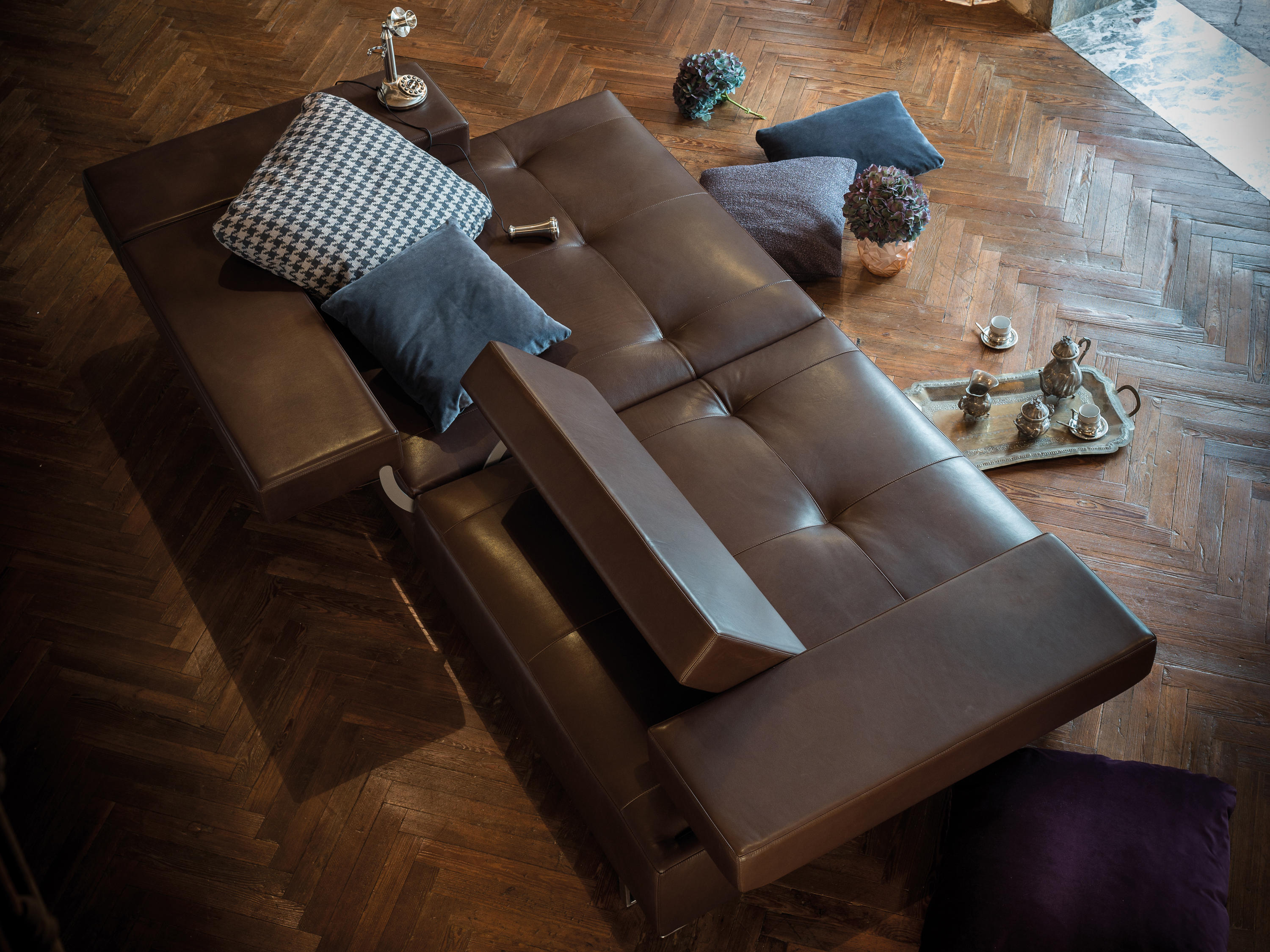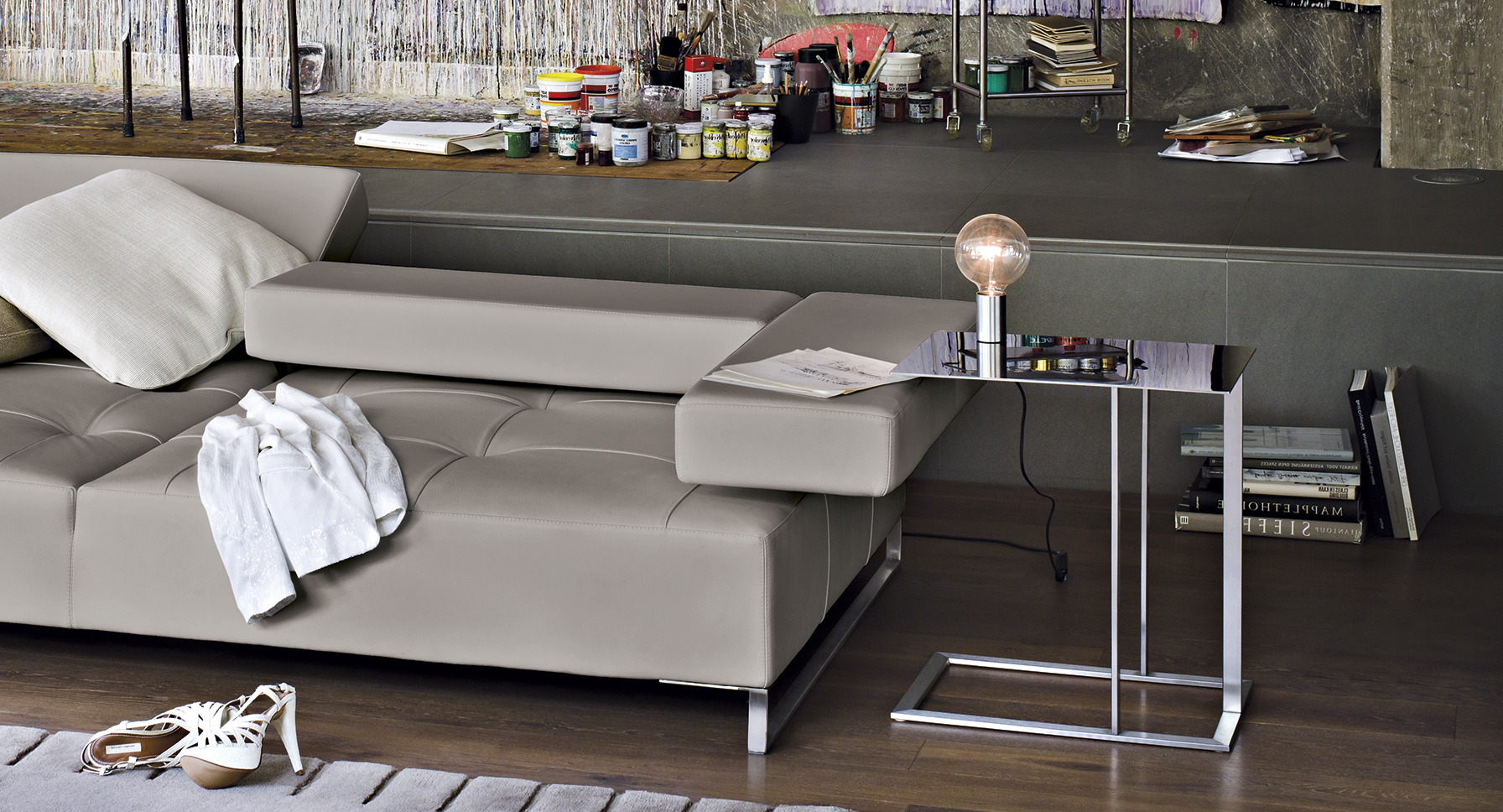 矩形形状的不锈钢咖啡桌,作为阁楼沙发的补充服务元素,它们可以自由地和沙发或扶手椅进行组合。