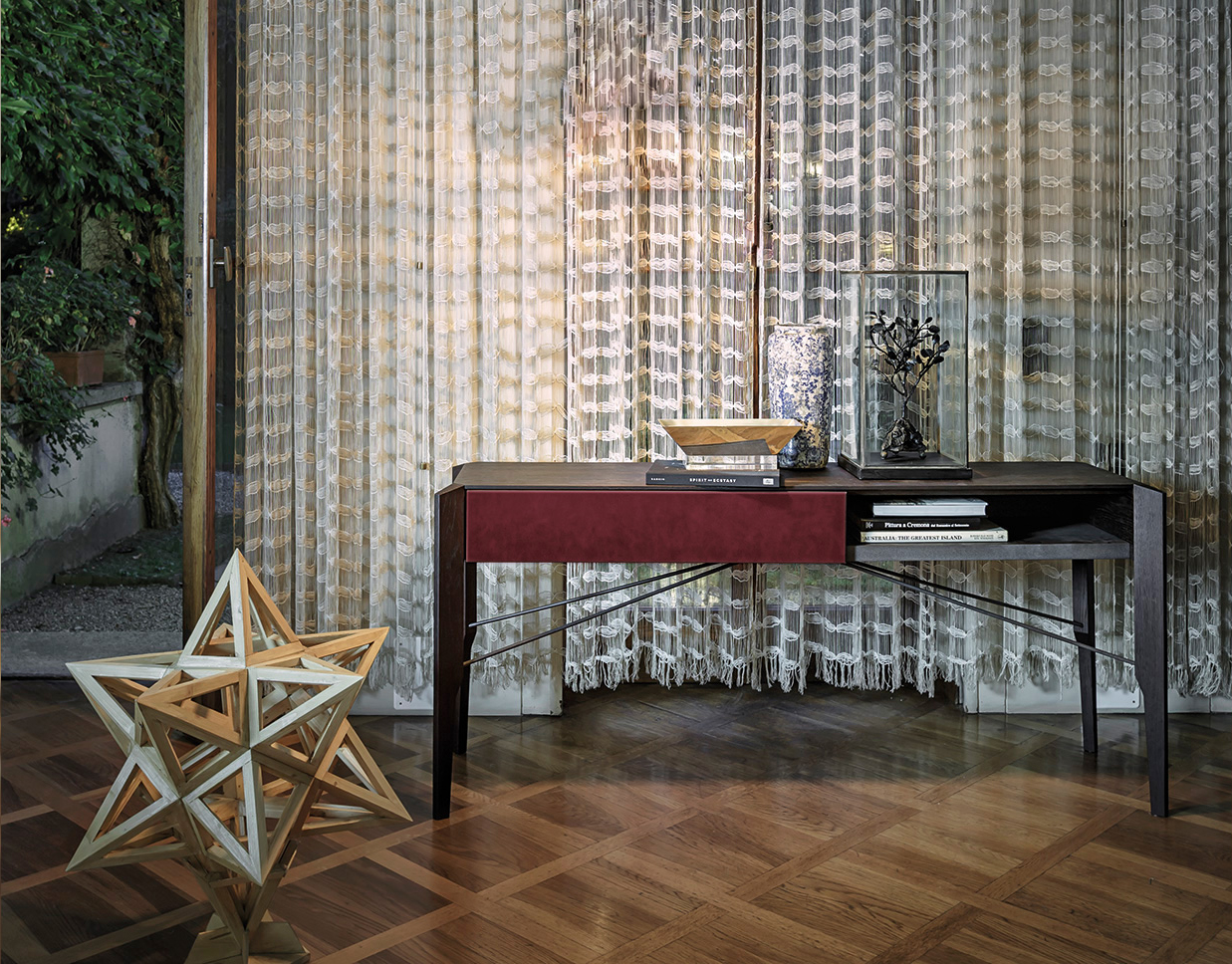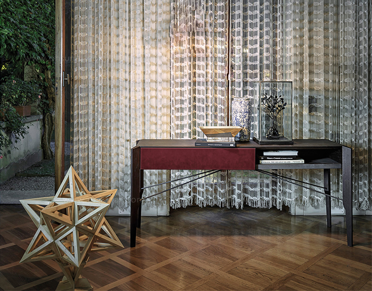 Manzoni & Tapinassi装饰柜的侧板可以在摩卡橡木、卡纳莱托胡桃木或苏皮亚木上选择制作,金属框架由云母褐色或镀锌钛制成。虽然它的结构看起来很薄,却起到了很好的支撑作用。