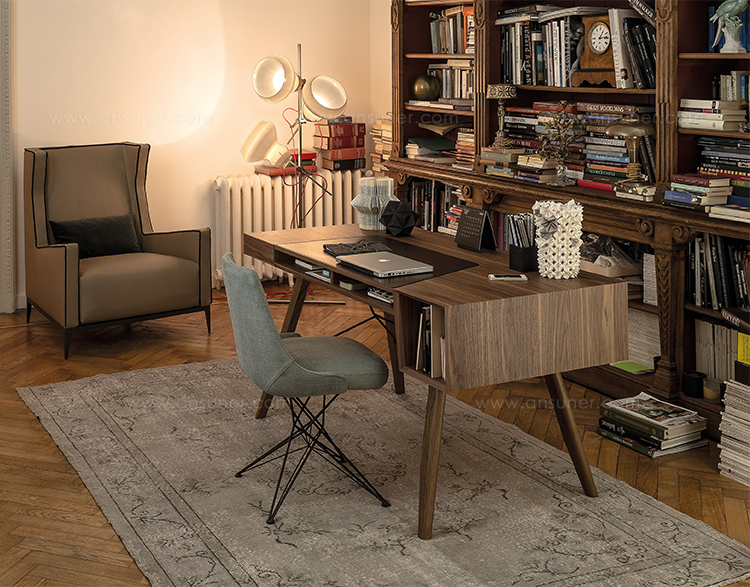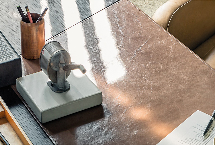 一个线性的、可适应的桌子,桌面配有皮革。这种金属镶嵌的纵横交错的底座让整个作品在纯粹的复古风格中增添了一种现代气息。抽屉的设计赋予了深度和功能,让它不仅是一个工作桌,还可以存放一些私密的文件。