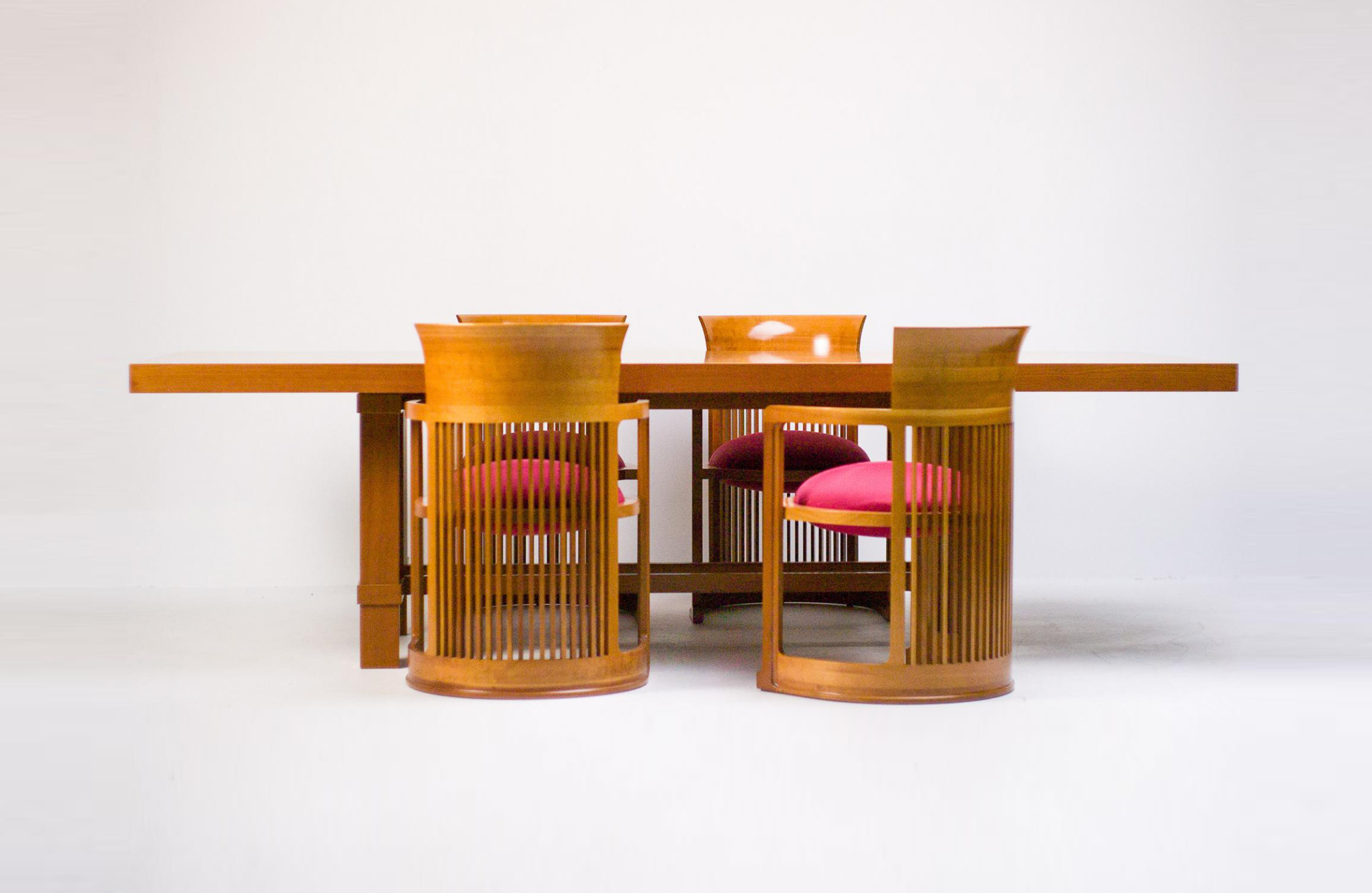 曲背餐椅,采用天然樱桃木、樱桃木色或黑色的胡桃木制造。塑料座面采用聚氨酯海绵和喷胶棉填充。座面软包为皮革或布艺面料。