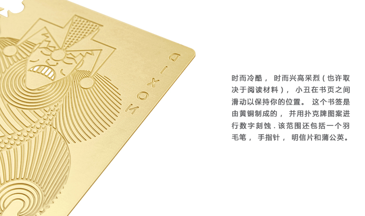 时而冷酷,时而兴高采烈(也许取决于阅读材料),小丑在书页之间滑动以保持你的位置。这个书签是由黄铜制成的,并用扑克牌图案进行数字刻蚀.该范围还包括一个羽毛笔,手指针,明信片和蒲公英。