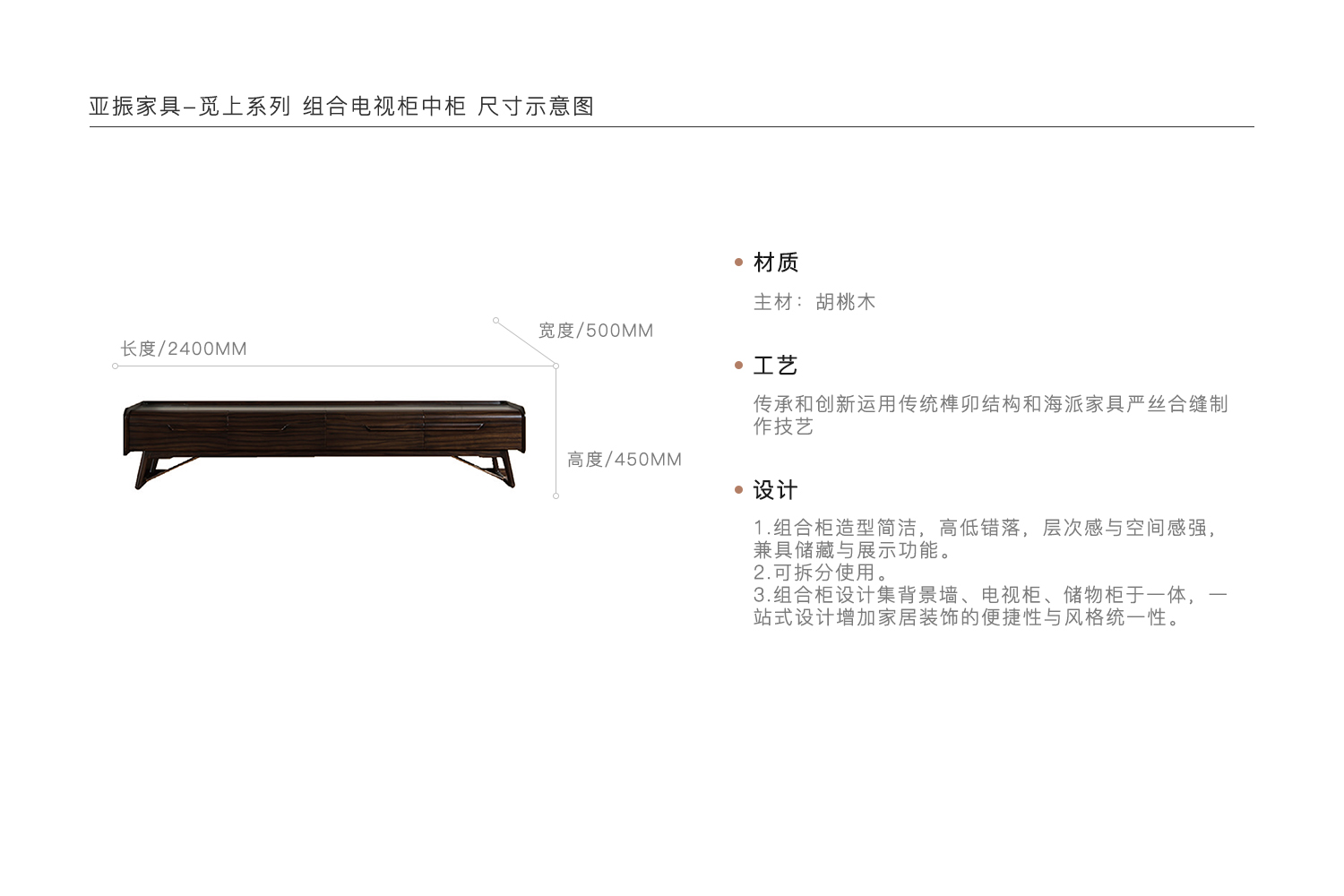 1.组合柜造型简洁,高低错落,层次感与空间感强,兼具储藏与展示功能。 2.可拆分使用。 3.组合柜设计集背景墙、电视柜、储物柜于一体,一站式设计增加家居装饰的便捷性与风格统一性。