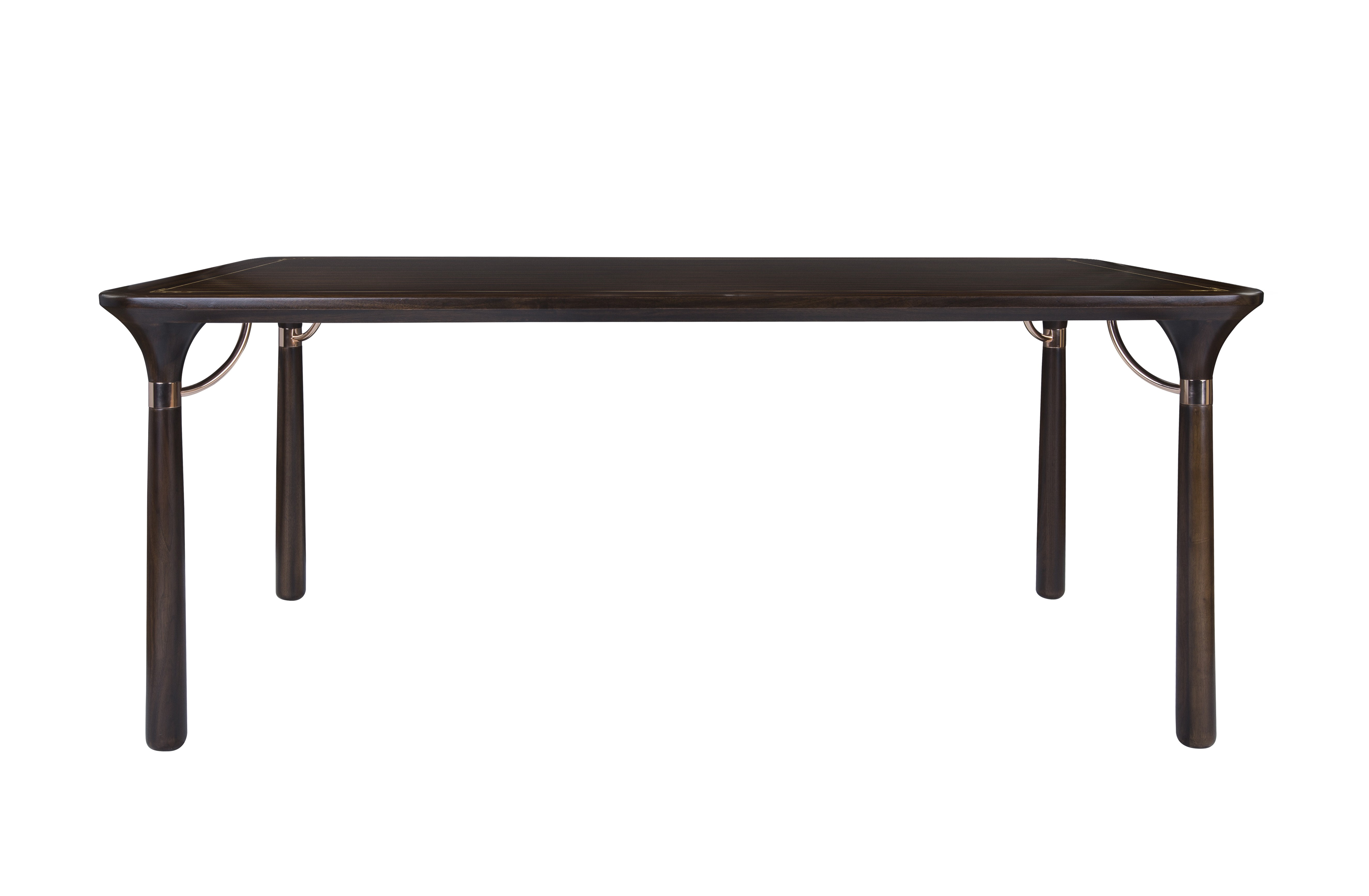 1.餐台造型简洁精巧,源于明式家具形制,以线为主,通透灵动。 2.餐台四角采用中式传统家具中霸王枨造型,同时以铜制装饰,稳固大方,美观典雅。