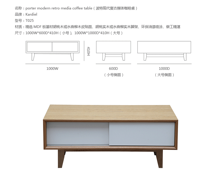 porter modern retro media coffee table(波特现代复古媒体咖啡桌)是Kardiel公司制作的经典实木家具,具有世纪中期的现代风格,咖啡桌下面左右滑动的抽屉可以兼具书柜及存储功能。制作采用精选MDF板基材胡桃木或水曲柳木皮贴面、胡桃实木或水曲柳实木脚架、环保油漆喷涂、做工精湛。
