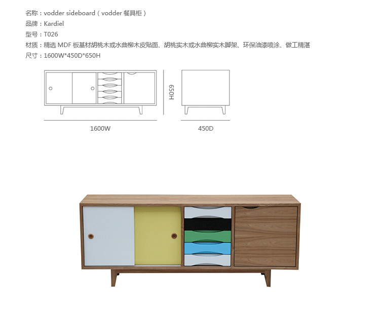vodder sideboard(vodder餐具柜),Arne Vodder设计的作品,是Kardiel公司制作的经典实木家具,具有世纪中期的现代风格,加了少许复古现代主义色彩于其,微妙的局部拱曲线呈现在右手面对推拉门和5个拉出抽屉。在现代主义的存储家具上,Finn Juhl和Arne Vodder最先尝试胶木和天然木的组合运用。这是大胆的创新,他们结合传统的新鲜的新兴技术与现代主义的概念。制作采用精选MDF板基材胡桃木或水曲柳木皮贴面、胡桃实木或水曲柳实木脚架、环保油漆喷涂、做工精湛,是您理想的选择。