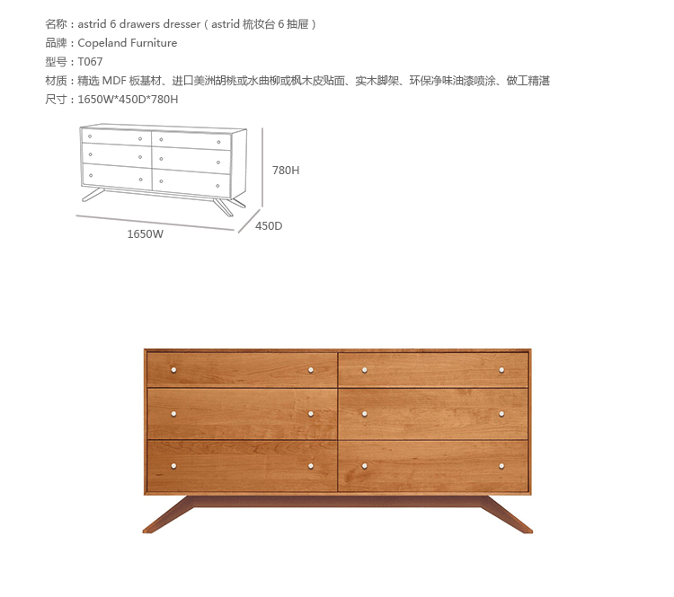 astrid 6 drawers dresser(阿斯特丽德6抽梳妆台)是Copeland Furniture公司astrid实木梳妆台系列之一,宽大的八字形脚架非常吸引人注目,制作并非易事,它其实是一个大工程,同时能引发无限期望和激情,6个平滑抽屉,可以给与提供许多存储空间。制作采用精选MDF板基材、进口美洲胡桃或水曲柳或枫木皮贴面、实木脚架、环保净味油漆喷涂、做工精湛。