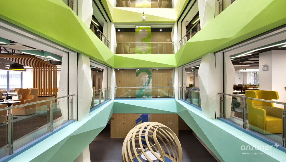整个中庭为本案的亮点。设计师利用建筑的结构优点,并为了更好地展示出每层的特色,采用了腾讯文化中的几个主色调,不同的色调代表着每层的空间色彩效果。为了使中庭的空间感更为突出并结合设计理念中的造型元素,每层楼板外立面及柱体,都运用了立体式折线的效果。从中庭对应的一楼休闲区也设计了三组采用地球轴线组合而成的有趣的休闲讨论区,既有开放的效果,又有一定的分割隐私作用。