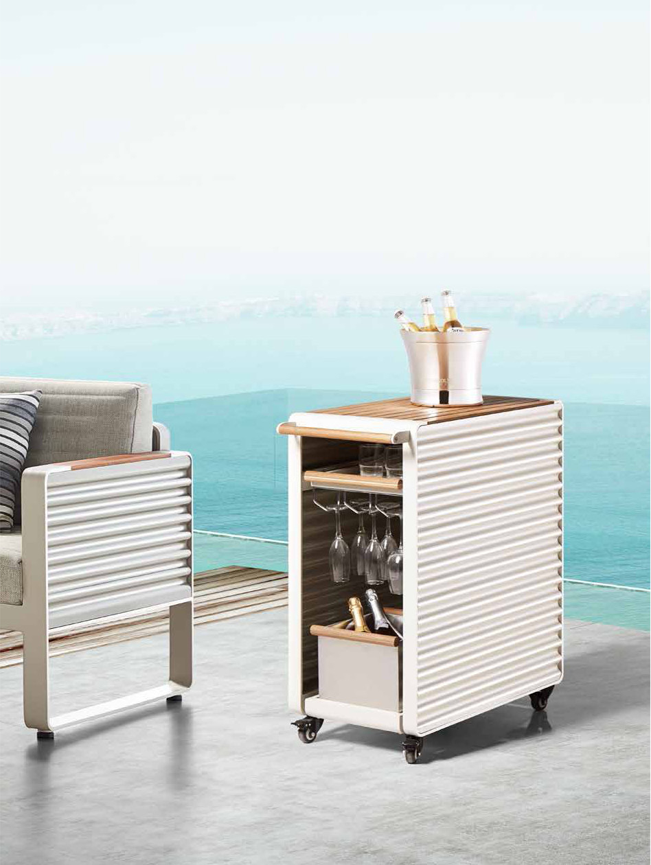 艾尔伯特系列由弯压而成的 T 型铝管和波纹金属板材精心打造而成。 其中波纹状金属板(CSM)曾被德国德绍容克斯飞机公司推选为制 作首批和最大的舰队商用飞机的最佳材料。 波纹状金属板(CSM-Corrugated sheet-metal)由钢铁或铝制成, 一般被广泛用于私人或者商业建筑物的墙体及屋顶。按照各种大小 比例排列成型的波纹可以持续使用,美感的外观经久不衰。 波纹状金属板(CSM)使用广泛并且低成本,生产程序简单但应用 是无限的,之后高端耐用的旅行箱的标准外观也采用了这种经典波 纹设计。 这也是为何设计师选择了艾尔伯特(Airport)予以命名。如图所示, 波纹氧化板巧妙地嵌进平面金属结构中。 按照建筑比例和元素,艾尔伯特(Airport)户外系列可以很好地融入 公共场所及使用于私人花园及露台。