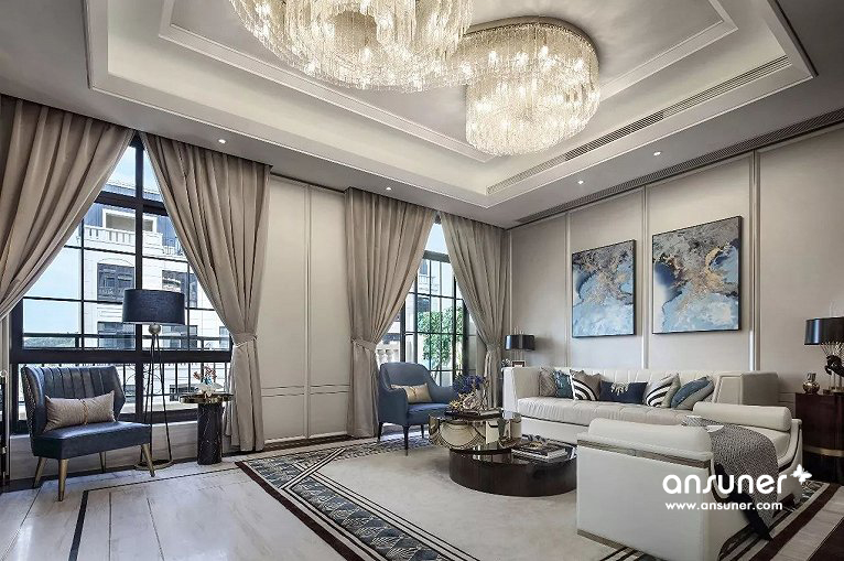 客厅整体空间为浅色系,线条简洁硬朗,象牙白的背景色,奠定了空间低调的质感、优雅的基调。设计师采用大量高级皮质材料,巧妙搭配自然质感的石材以及金属元素,璀璨的金色和几何经典,给予色彩最大的礼赞。流光溢彩的水晶吊灯尽显奢华,恰如一个浪漫的音符,赋予空间生动轻灵的魅力。