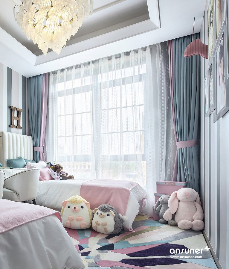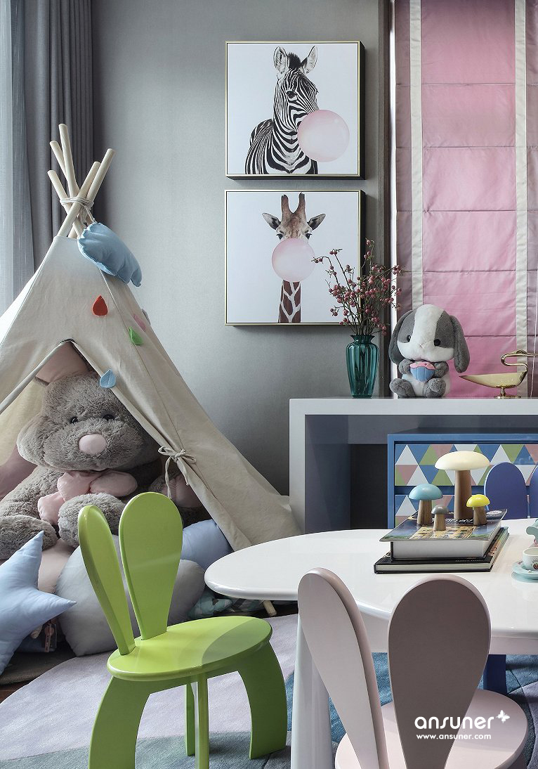 在女儿房设计中,经由马卡龙色调的清甜组合,一个甜美温馨的童话乐园于此诞生,柔软温暖的的拼布地毯上,安放着粉白相间的小床,可爱的动物们相伴左右,一切的一切,仿佛都在共同制造着童年轻快的幻梦。一个浪漫的水晶饰品吊灯,散发出纯净通透的光,让甜蜜浪漫在空间萦绕着。