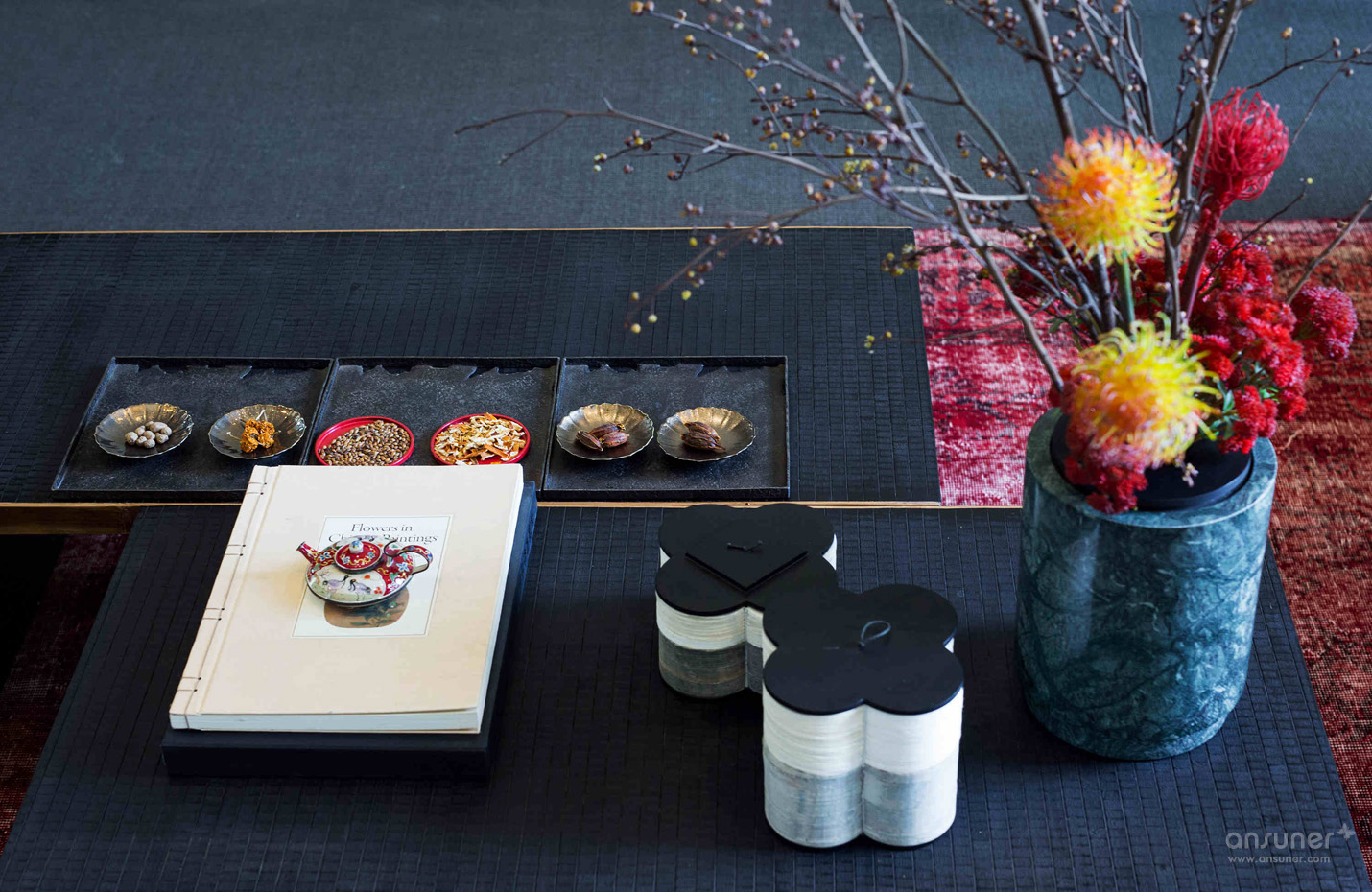 餐厅:餐厅延续了客厅的设计格调,捕获繁华绚烂中的一片宁静详和。青黑色的木桌、朱砂红的木制座椅、黑釉陶罐花樽,设计师运用意象叠加的手法,烘托出就餐区源自古老的韵味和踏实的生活情调。来自青年艺术家王志新的《花团锦簇》,极具张力的色彩与整个空间浑然一体。