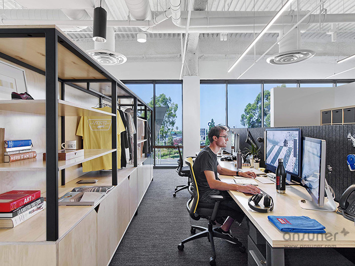 室内特别设计成混凝土水泥地面,鼓励大家踩着滑板在工作区之间自由穿梭。以开放式协作型设计理念塑造的工作环境,培养和促进积极的工作方式、以及协作和创新的工作文化。