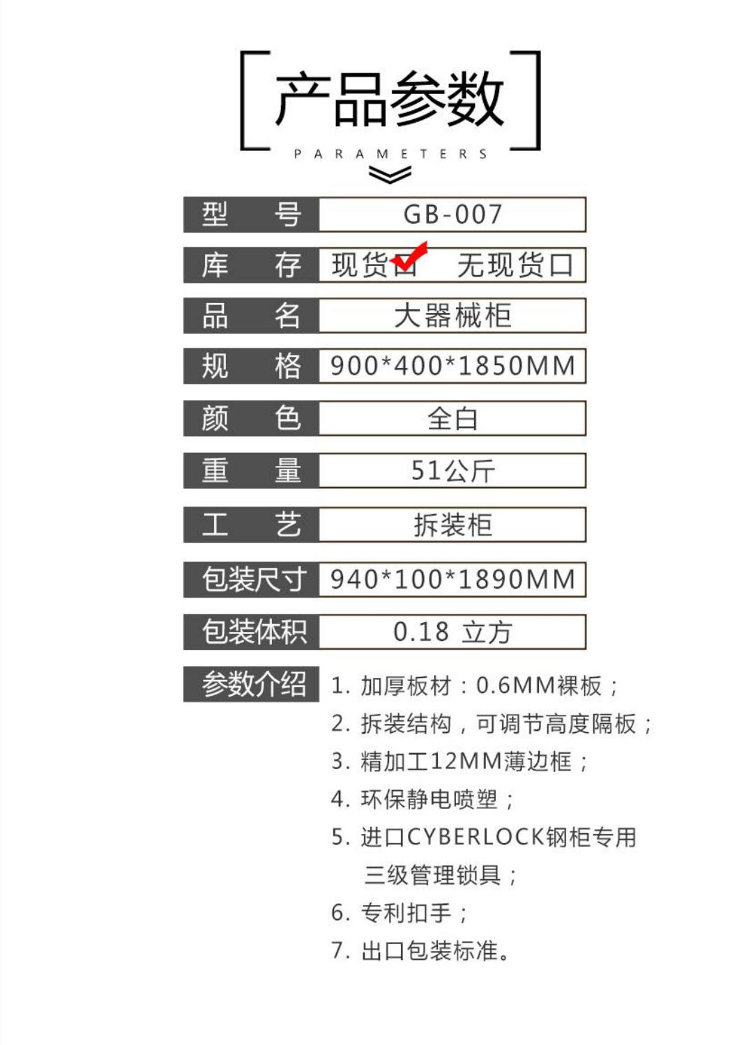 1加厚板材:0.6MM裸板 2.拆装结构,可调节高度隔板 3.精加工12MM薄边框; 4.环保静电喷塑: 5进口CYBERLOCK钢柜专用三级管理锁具; 6.专利扣手; 7.出口包装标准。